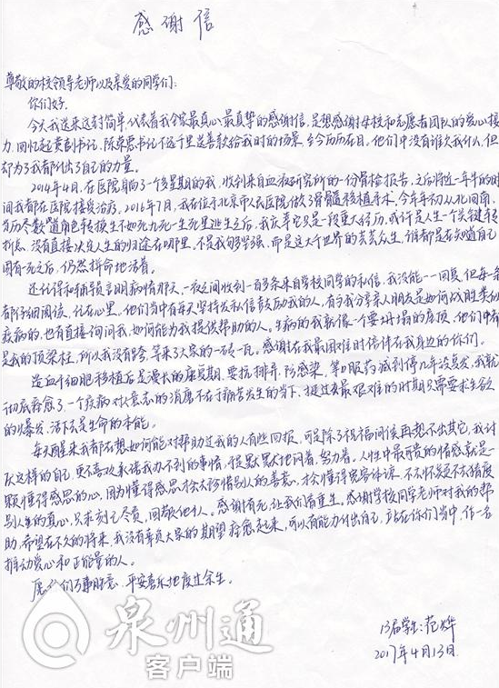 、 去年2月开始,东南早报(微博)持续关注并报道的身患再生障碍性贫血的泉州大学生范烨,在学校、媒体、各界爱心人士的帮助下,做了骨髓移植手术,手术很成功,已康复出院,目前身体恢复得不错。 ...