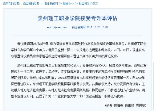 21日下午,福建省高等学校设置评议委员会专家组来晋开展泉州理工职业学院申本考察评估活动。泉州理工职业学院现有全日制在校生五千余人,专任教师近三百人。学校经过30余年建设,现有38个专业,发展成为一所工学、管...