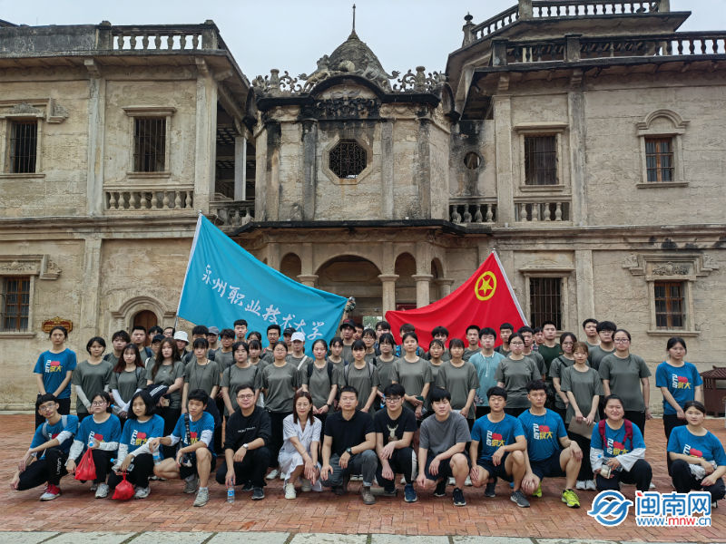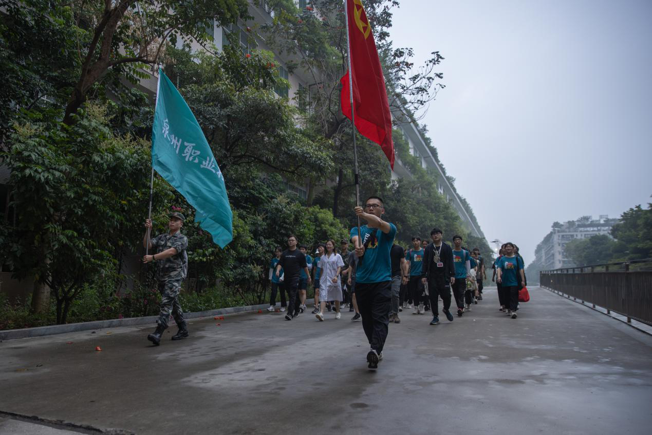 泉州职业技术大学开展主题团日活动。泉州职业技术大学供图 5月4日清晨5:04,泉州职业技术大学晋江校区100名师生徒步20公里前往晋江新塘街道梧林传统村落,用脚步丈量城市红色旅程,用心灵感受爱国热血温度,并完成传...