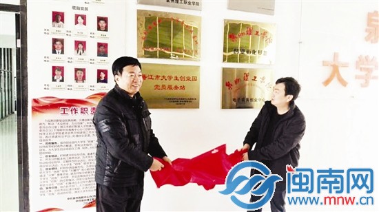 晋江市大学生创业园党员服务站,在泉州理工学院揭牌 N林继学 王见明 文/图 海都讯 昨天下午3时许,在泉州理工学院的创业楼,正在举办泉州市高教发展中心管委会办公室(以下简称“高教办”)党支部与泉州理工学院...