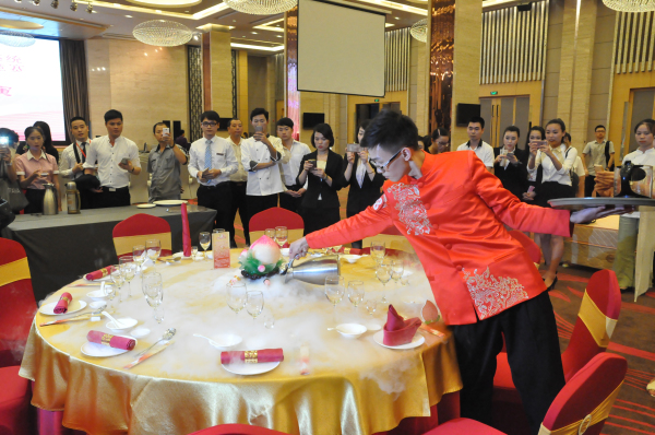郑俊在摆台比赛中 李晓晓在导游风采展示中获得冠军 我校学子陈晓萍(右4)、缪双惠(右5)在团体工装展示中 全体合影 此时,远在巴西里约正如火如荼地进行着奥运会,中国健儿们正在各自的舞台上...