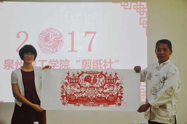 晋江剪纸协会名誉会长杨民兴与我校曾芳芳老师一起展示剪纸作品 剪纸大咖们与我校老师合影 剪纸大咖与我校剪纸社师生合影 “哇……这些剪纸好精美呀!”从三月份开始,我校2016-2017学年第二学期选修课正...