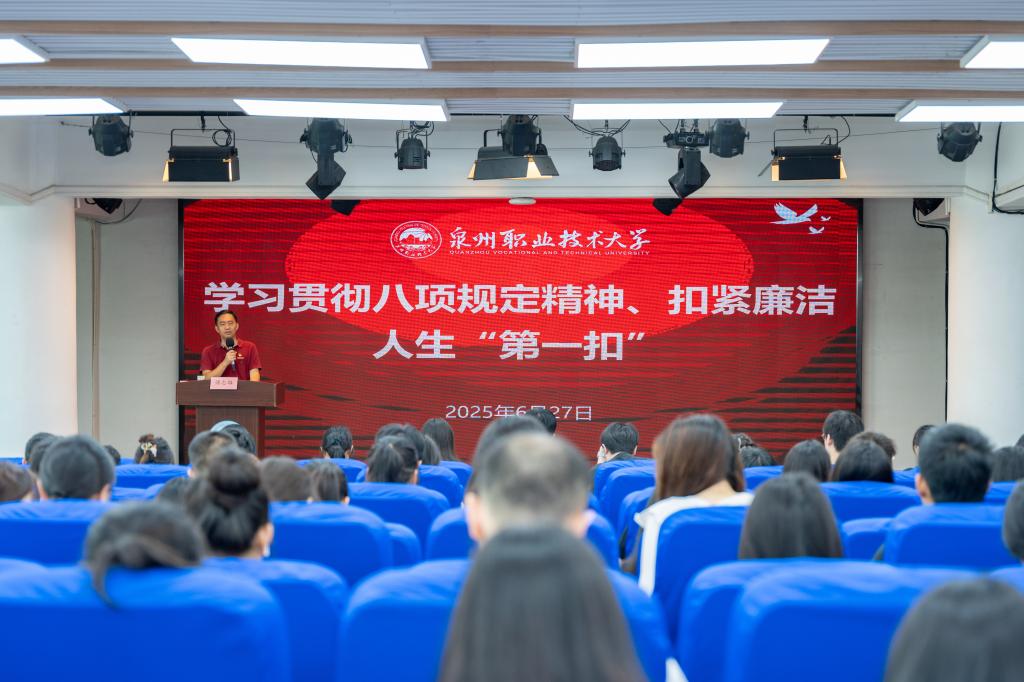 6月27日,泉州职业技术大学举办毕业生党员培训班,旨在提升毕业生党员的政治素养和纪律意识,为他们步入社会、开启新征程奠定更加坚实的思想基础。培训班首场专题报告由学校党委书记傅志雄主讲,他以“学习贯彻中央八项规定精神,扣紧廉洁人生‘第一扣’”为题,为毕业生党员带来一堂生动的廉政教育课。傅书记围绕“历史维度、理论内涵、实践要求”三个层面展开讲授:从历史维度,系统梳理了中央八项规定出台的时代背景与演进历...