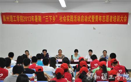 7月 11日晚7点,由校团委举办的“实践激扬青春志 奋斗成就中国梦”泉州理工学院2013年暑期“三下乡”社会实践活动启动仪式暨青年志愿者培训大会在 238教室顺利举行。学校党委副书记黄志梅、晋江团市委副书记卢奕...