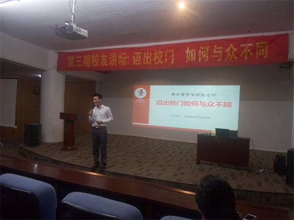 7月27日,泉州理工学院举行第三期“校友讲坛”,此次主讲校友为2012届毕业生,工程造价专业的林艺伟,现任聚成股份泉州分公司营销总监一职,他通过自己在学校的经历,工作上的经历与成就与学弟妹们一同分享,他希望通过自己的例子能够帮助学弟们们在今后的工作中有所帮助。
