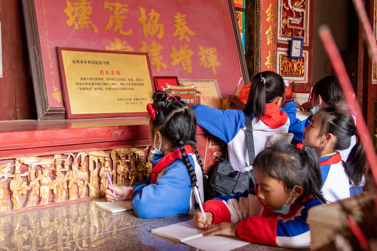 教育需要实践,成长需要体验。随后,大小记者开展了以 “绿色渔村”为主题的研学活动,深入到围头村几处重要的宗祠、古厝进行参观、采访。