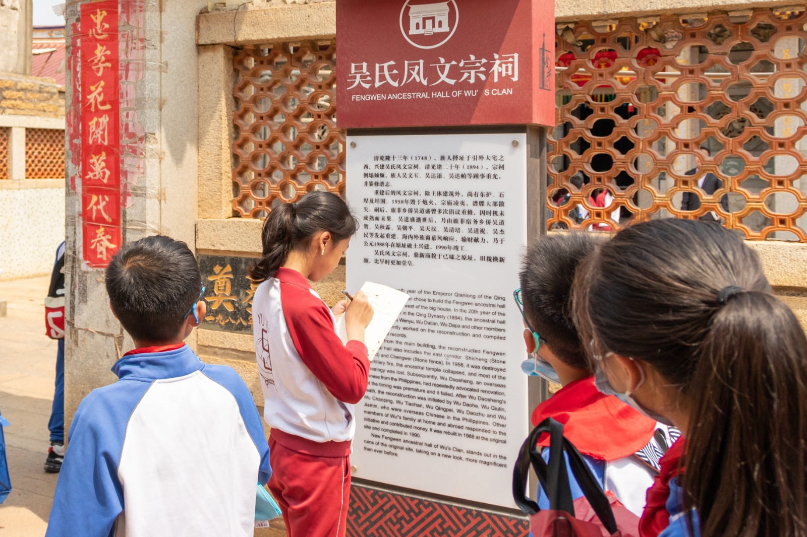 小记者们随着讲解员——围头村的文史研究专家吴尊悦先生的介绍,时而快速地记录着,时而沉静地凝眉思考着,时而兴奋地讨论着。在吴氏凤文宗祠和周氏宗祠这两座古朴端庄的祠堂里,在达屋楼这座曾是抗战时期的重要指挥所的围墙旁,在简朴肃穆的吴道盛家庙大门前,小记者们充分感受围头众乡贤慷慨解囊,造福家乡的动人情怀,体会到忠孝双全等诸多良好家风的深刻影响。