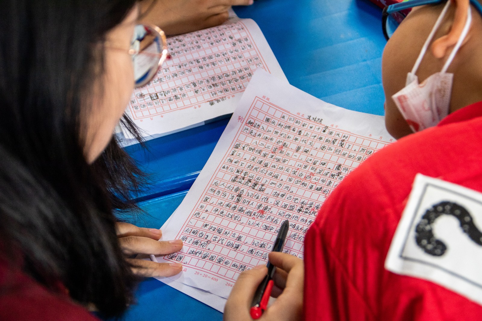 下午,经过一番实地采风的小记者回到教室,将此次研学活动的所见所感用文字表达出来。大记者则从字句的表达、段落的安排、写作的技巧等方面,对小记者进行一对一细致辅导。