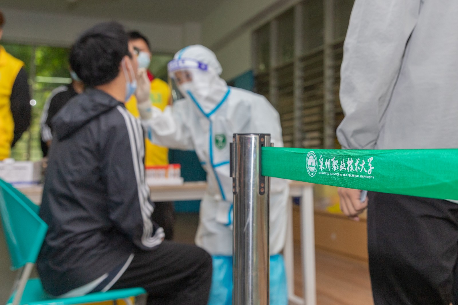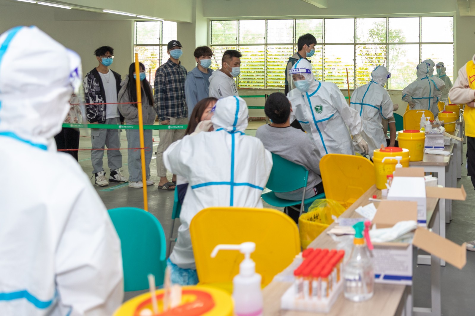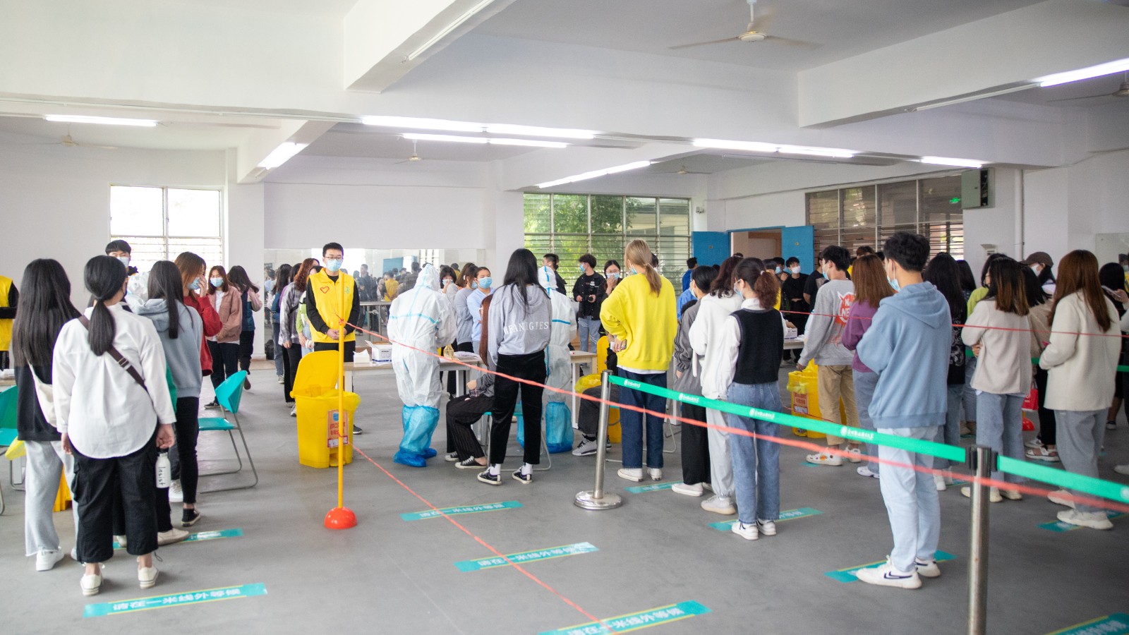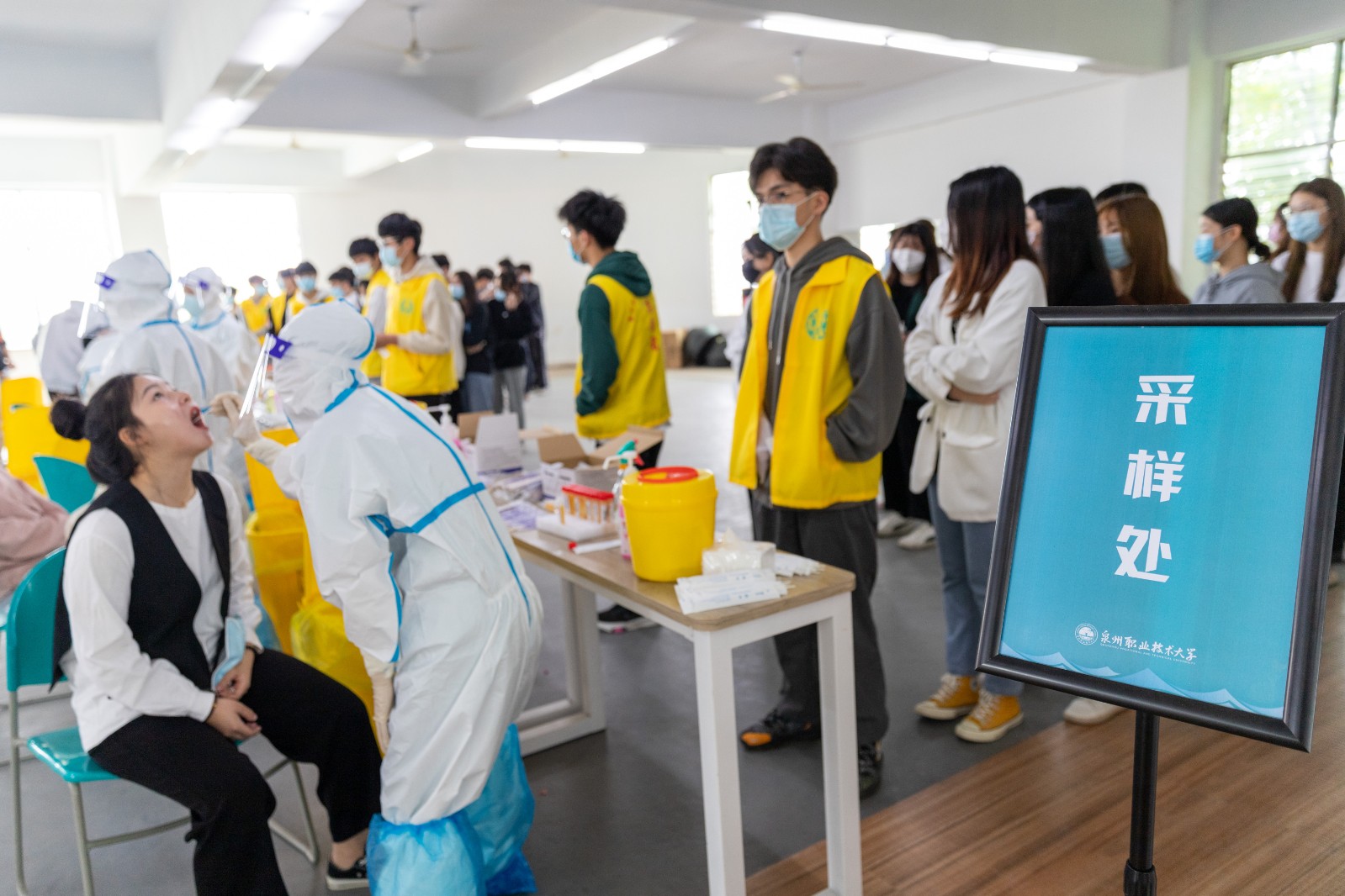 为确保检测工作顺利开展,学校统一在5楼会议室和教室内外合理划分区域,分别设置集合区、等候区、排队区及采样区,同时开通多条检测通道,医护人员不畏辛劳,细致耐心地进行采样。