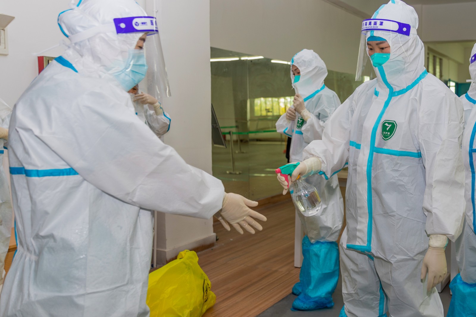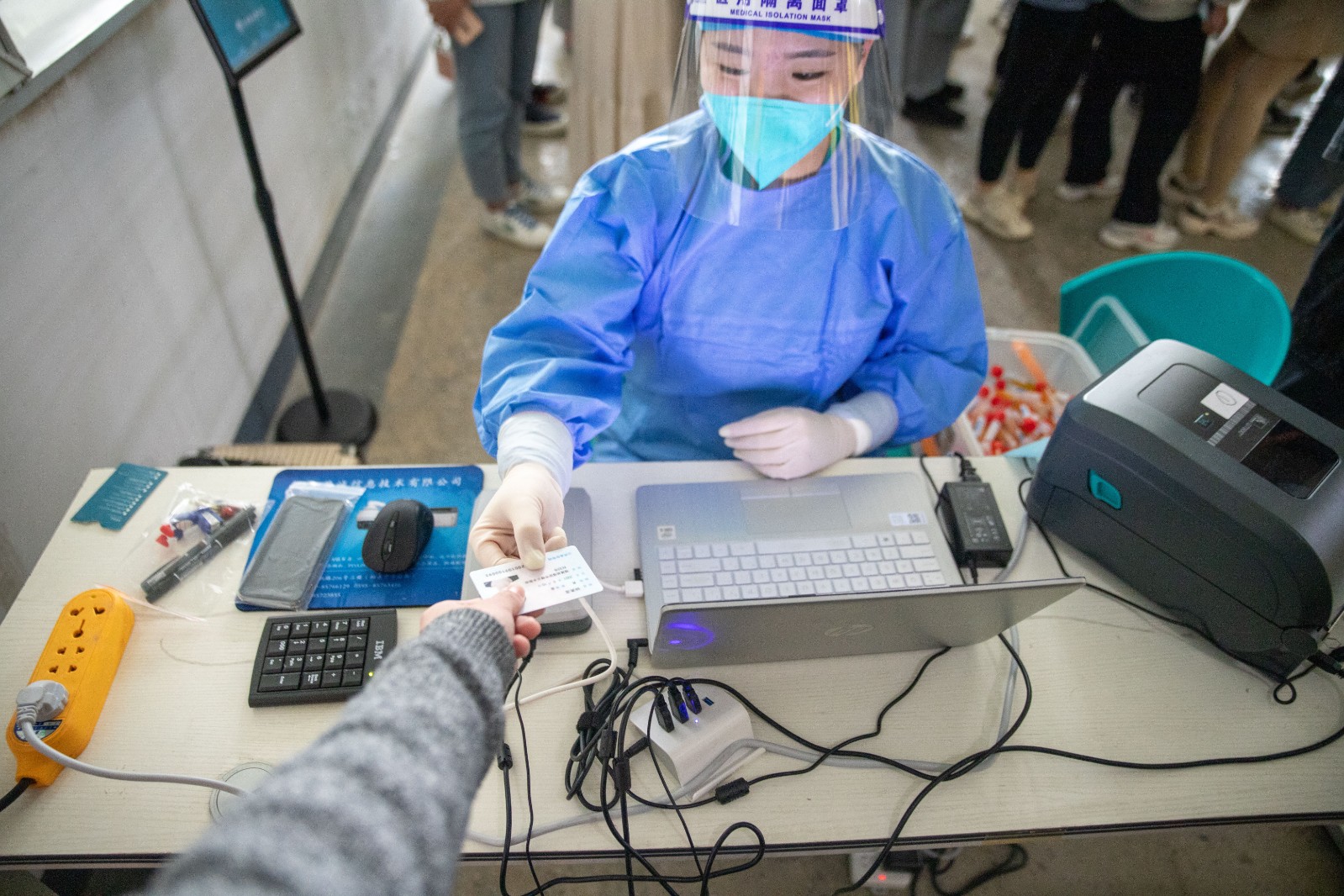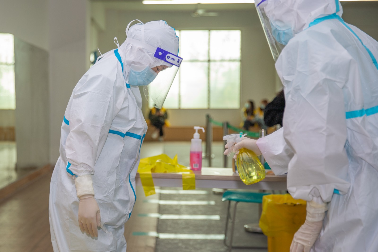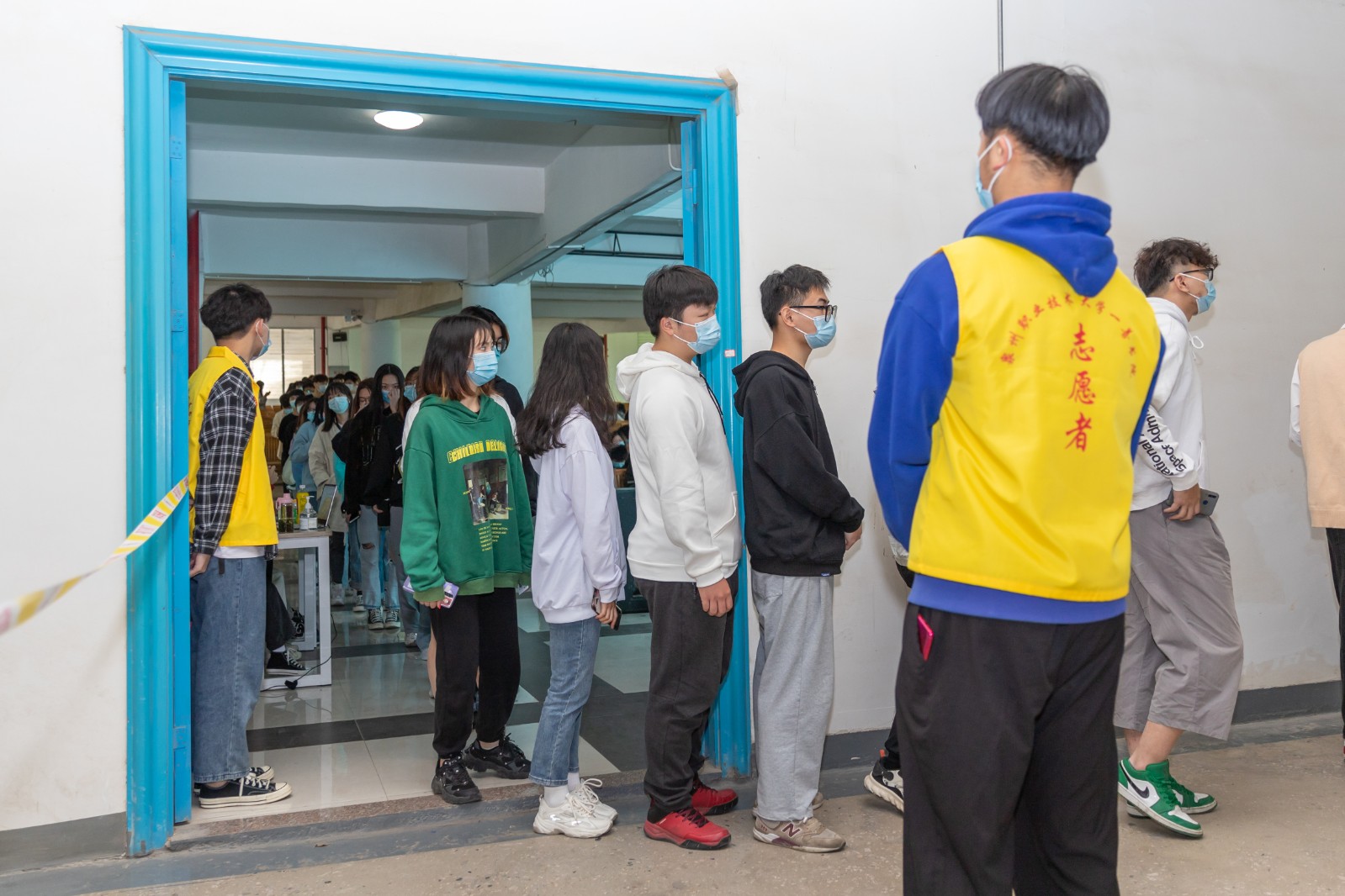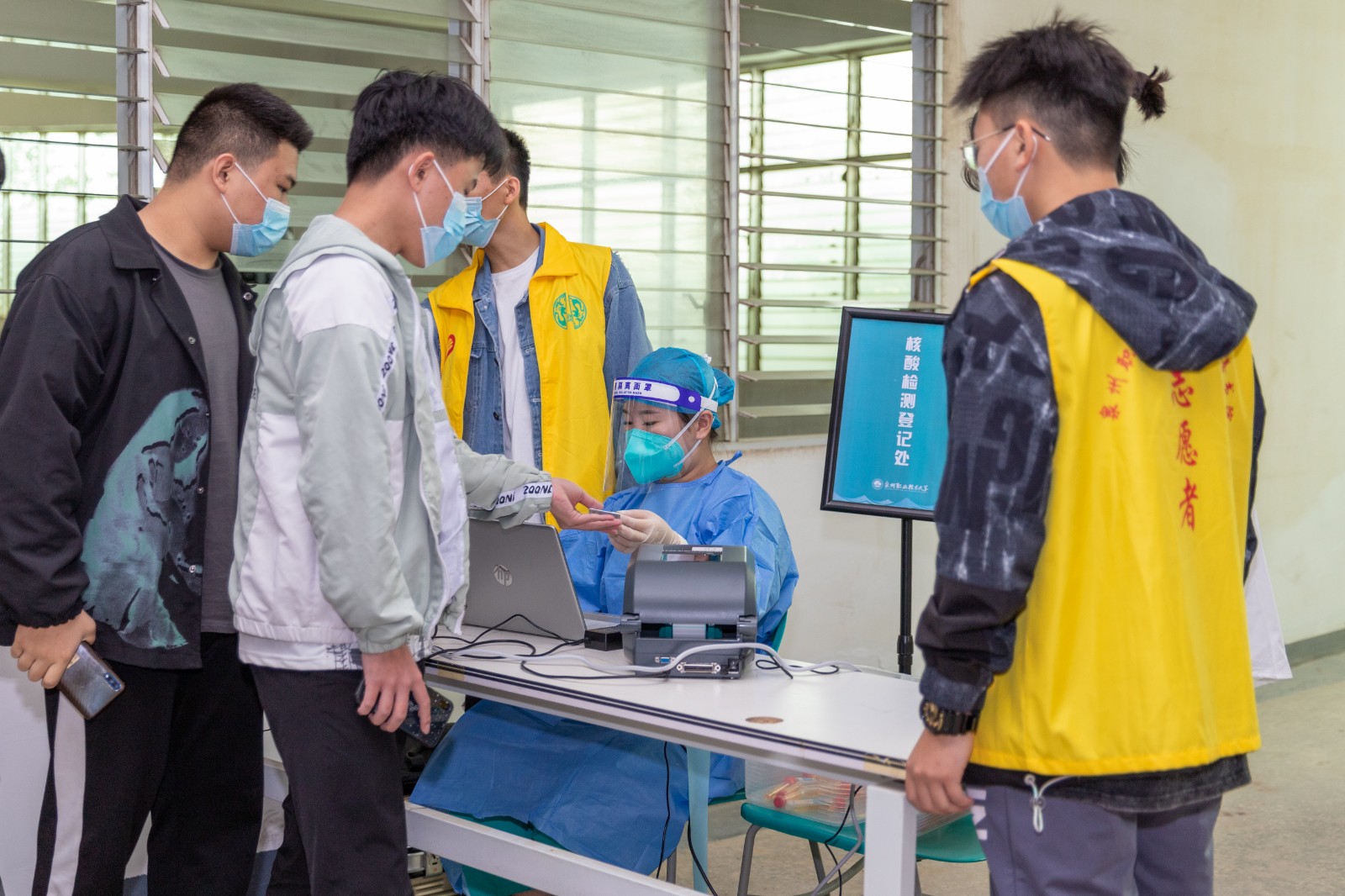 为确保检测工作顺利开展,学校统一在5楼会议室和教室内外合理划分区域,分别设置集合区、等候区、排队区及采样区,同时开通多条检测通道,医护人员不畏辛劳,细致耐心地进行采样。