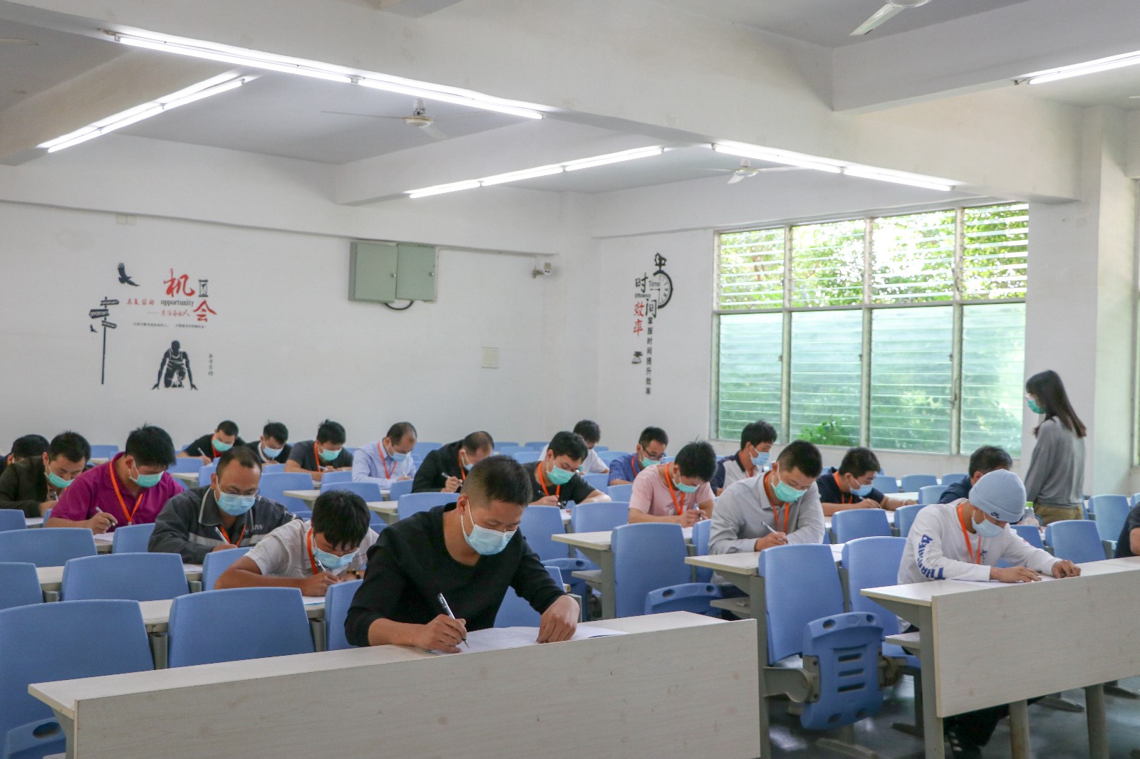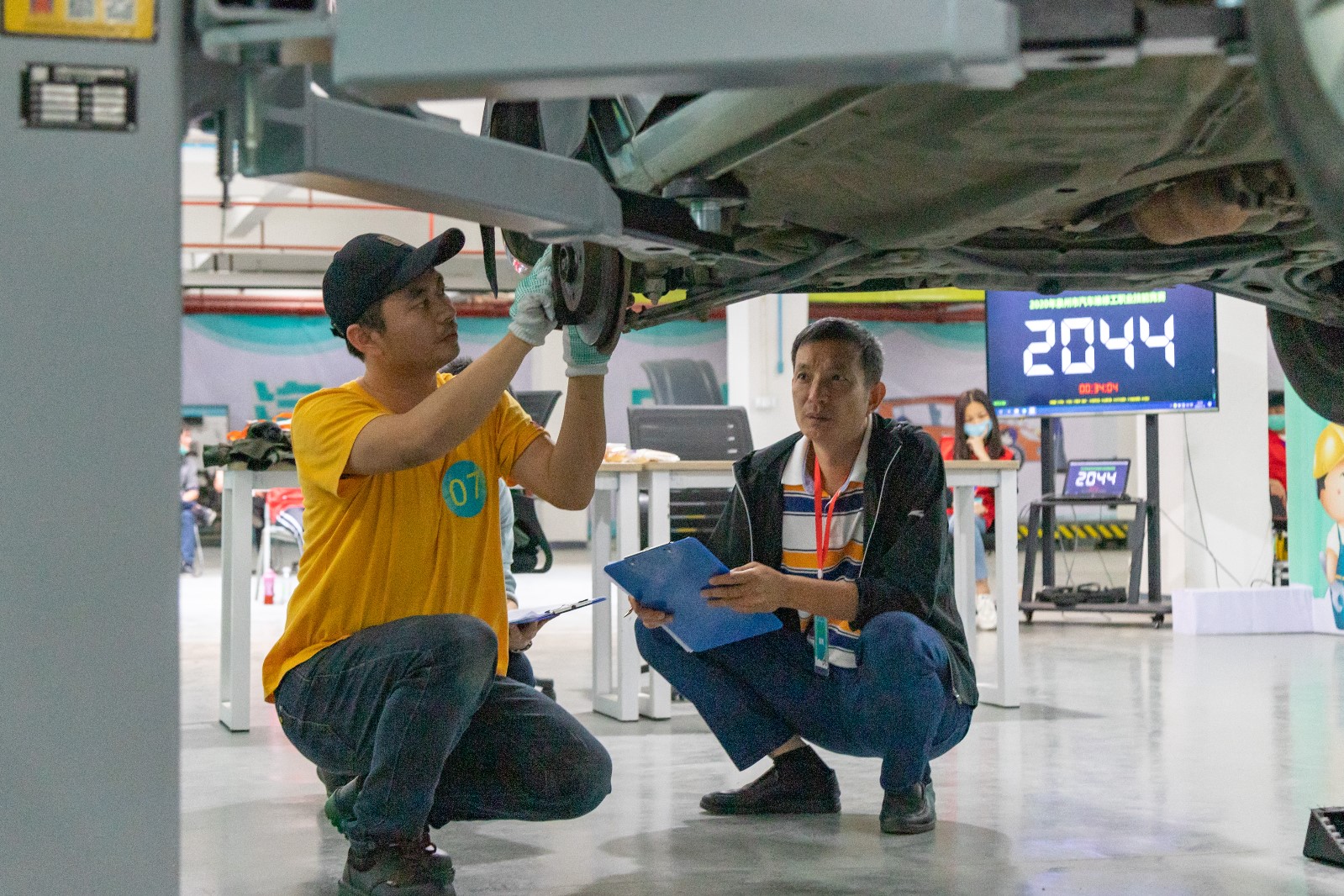 笔试环节选手们认真作答,奋笔疾书;实操考核进行汽车故障诊断与排除,为各种车辆解决“疑难杂症”。经过层层激烈考核,共决出7名选手晋级,他们将代表泉州市参加省级竞赛。
