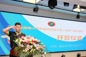 卡尔美中国有限公司福建省运营中心负责人钟松陵致辞,卡尔美一直关注支持中国足球,将竭尽所能为做好夏令营服务保障工作,祝愿本次活动圆满成功。