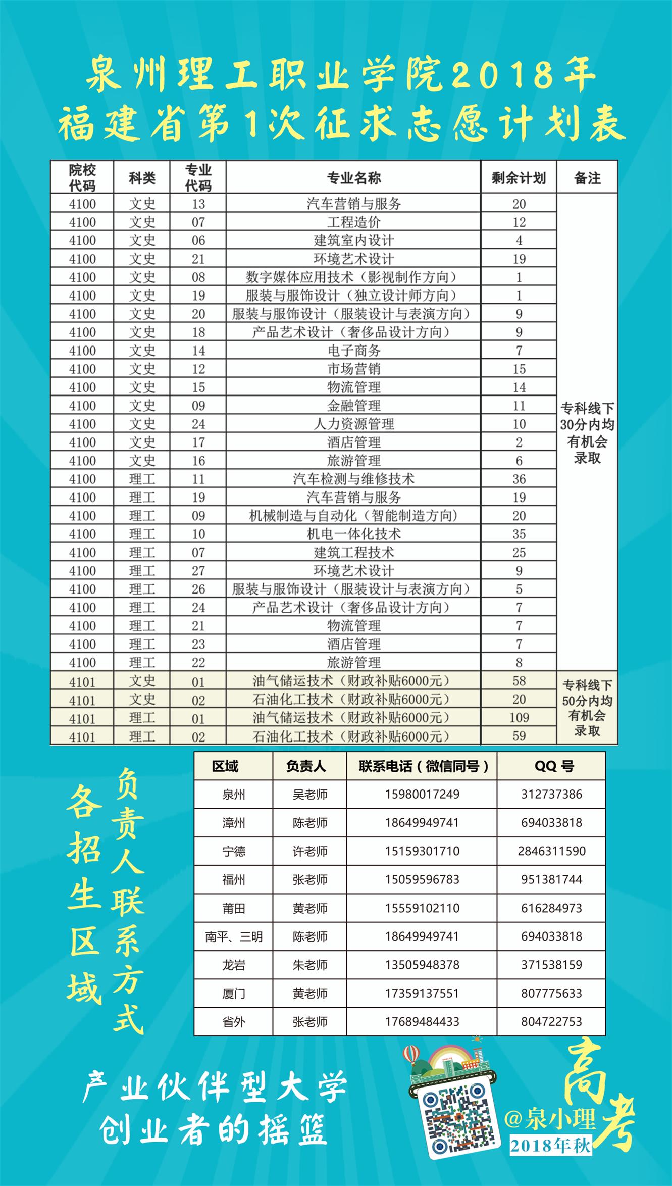 学校坚持“产业伙伴型大学”的办学定位和“创业者的摇篮”的育人定位,为学生就业创业保驾护航,毕业生历年就业率保持在98%以上,自主创业率高出全国3个百分点。 福建省文史理工类专科批次录取结果已经可以查询,泉州理工职业学院录取率创历史新高,其中美术类、编导类全录满,普通文史、理工类常规志愿尚有部分专业,第一次征求志愿计划564人,院校代码为 4100(专科线下30分内均有机会录取),院校代码4101(专科线下50分内均有机会录取),征求志愿计划详见附表。更多资讯及专业介绍请关注学校官方微信订阅号。