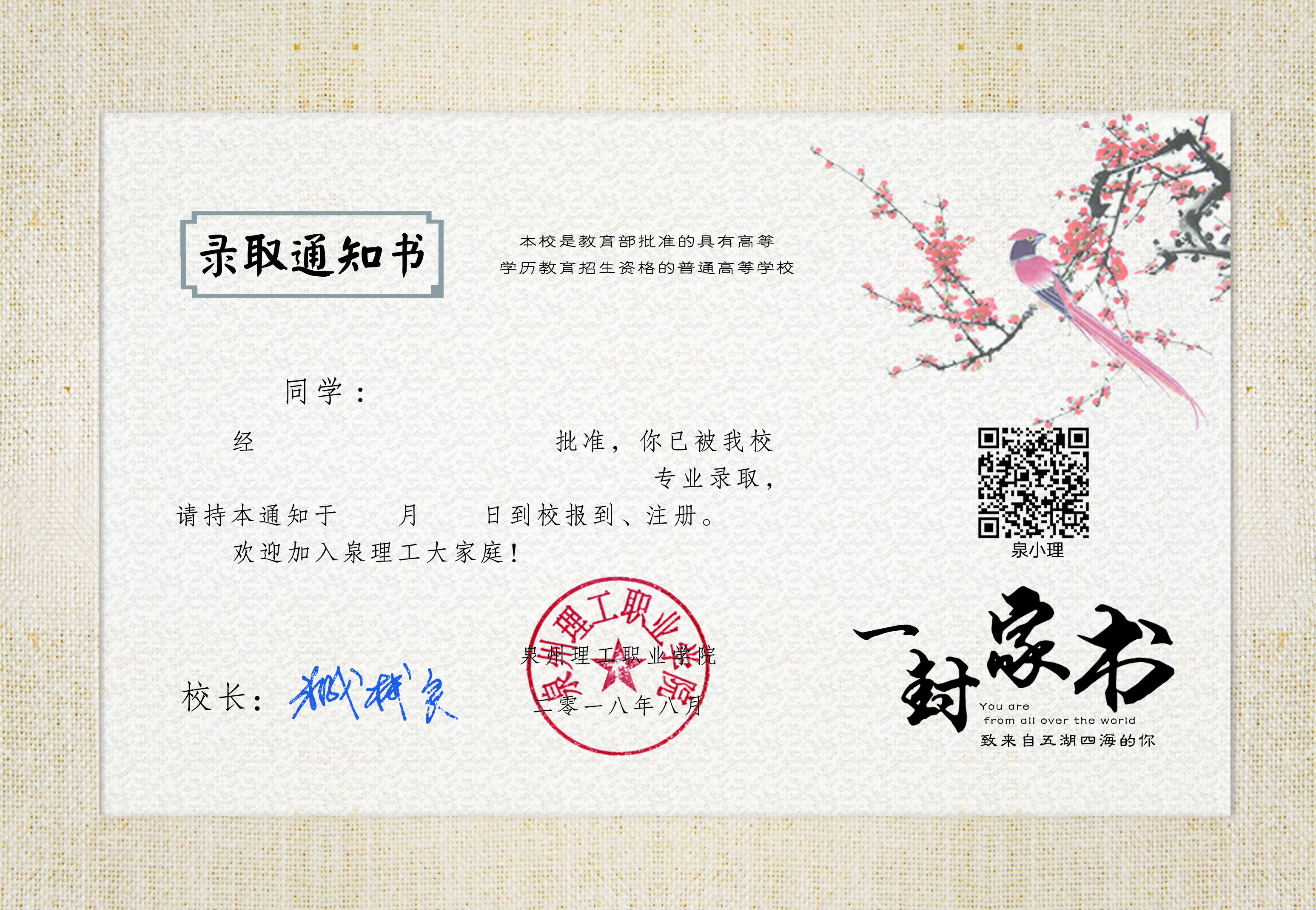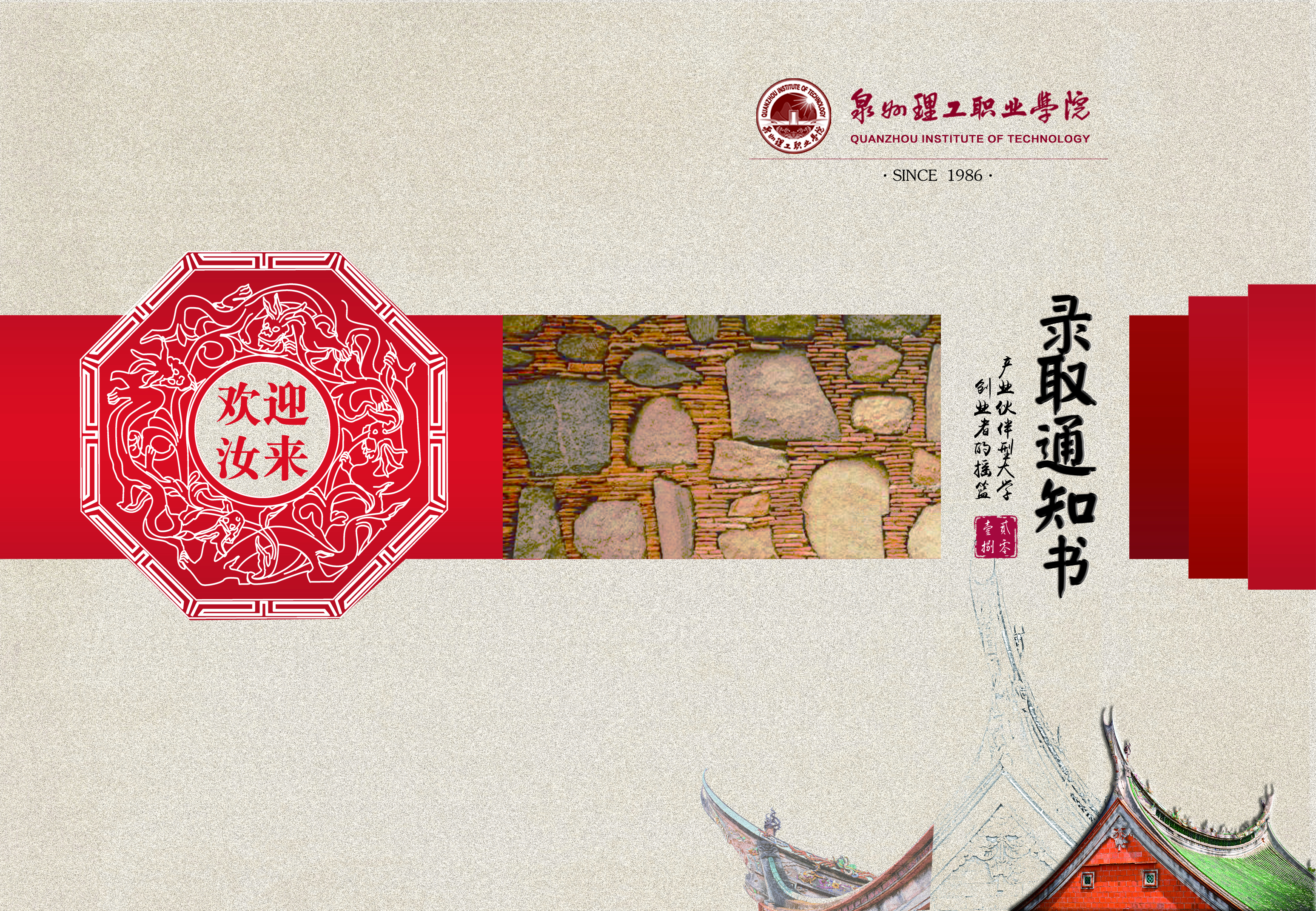 本次录取通知书以闽南元素为设计题材,今年是改革开放四十周年,践行“晋江经验”十五周年,所用元素皆源自于晋江本土文化。欢迎汝(Li)来:这是一句地道的闽南方言,我们热情好客,海纳百川,欢迎全国各地的学子成为新理工人。