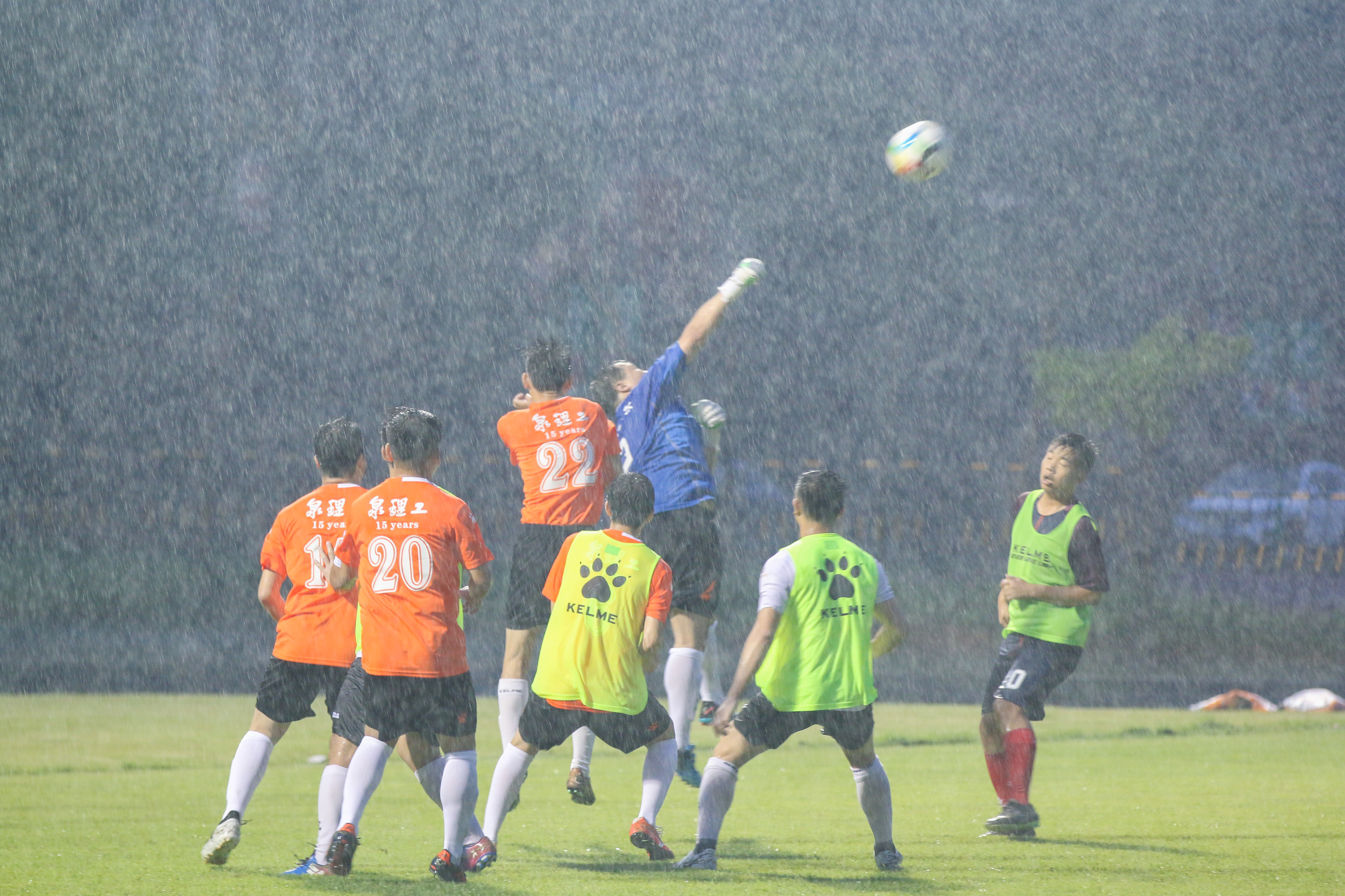 下午五点,历届校足球队队员分为老中青三代(02-06级,07-11级,12级-在校学生),在我校刚刚举办完亚洲大体联中国选拔赛的新球场上举行足球嘉年华。开赛不久,天公作美,滂沱大雨让这场深情的嘉年华成为史上最“酣畅淋漓”的纪念赛!第1场由元老级对战中生代,元老队以1比1的比分战平中生队,第2场中生代以2比1的比分战胜新生代,第3场元老级以4比4的比分战平新生代。