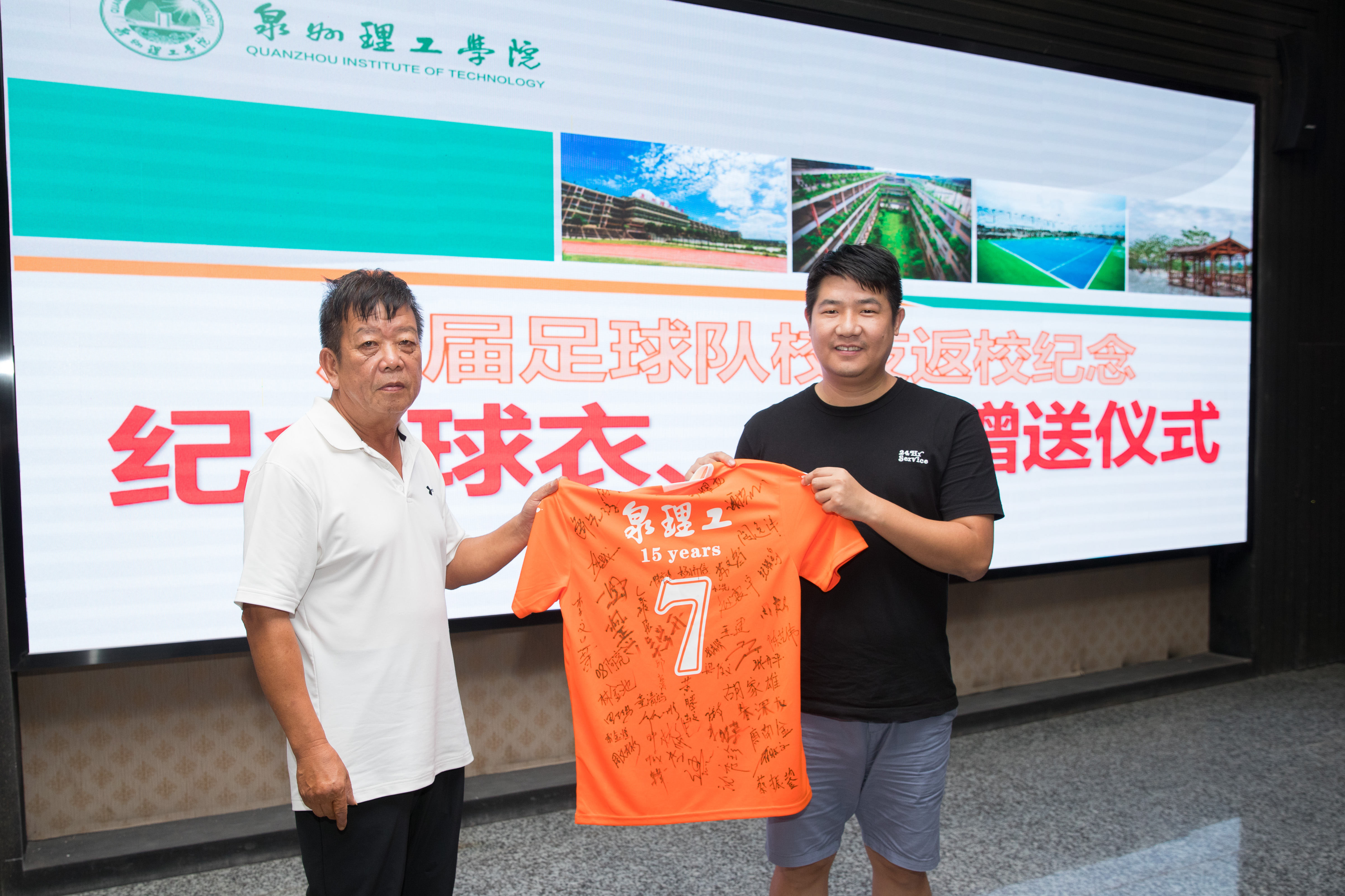 全体校友在纪念版球衣、足球上签名,足球队校友会会长王建(04级)、2003级校队队长林立分别代表历届校友向母校赠送纪念版签名球衣、足球。在会后,校友们参观校园、校史馆,了解了母校近年来取得的各项成绩,其中我校的多项科研成果、校企合作项目都与校友企业相关,也期待更多的校友们与母校的发展共生共荣。