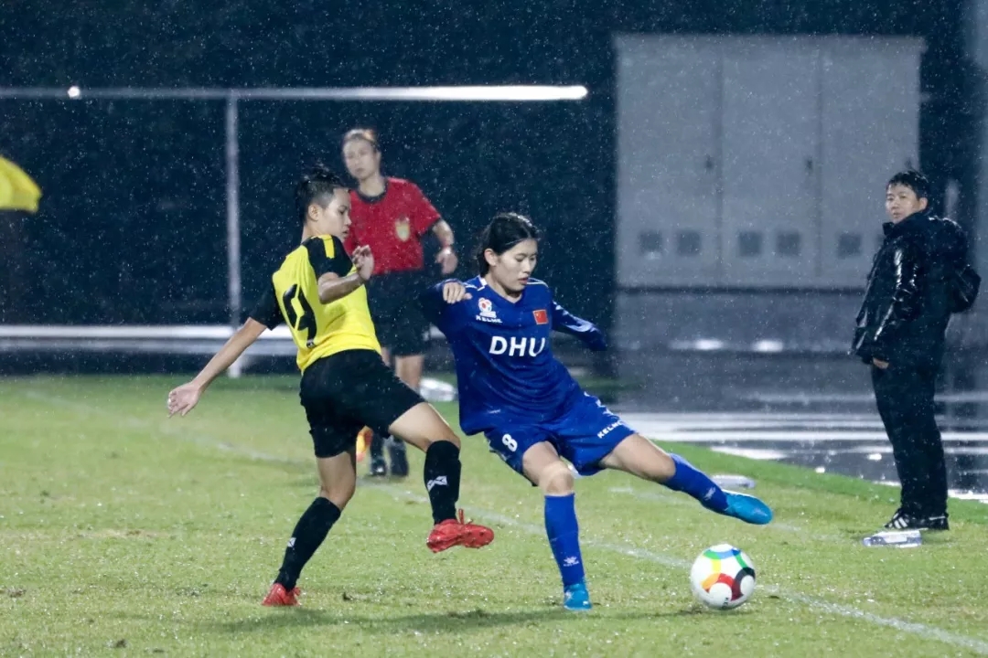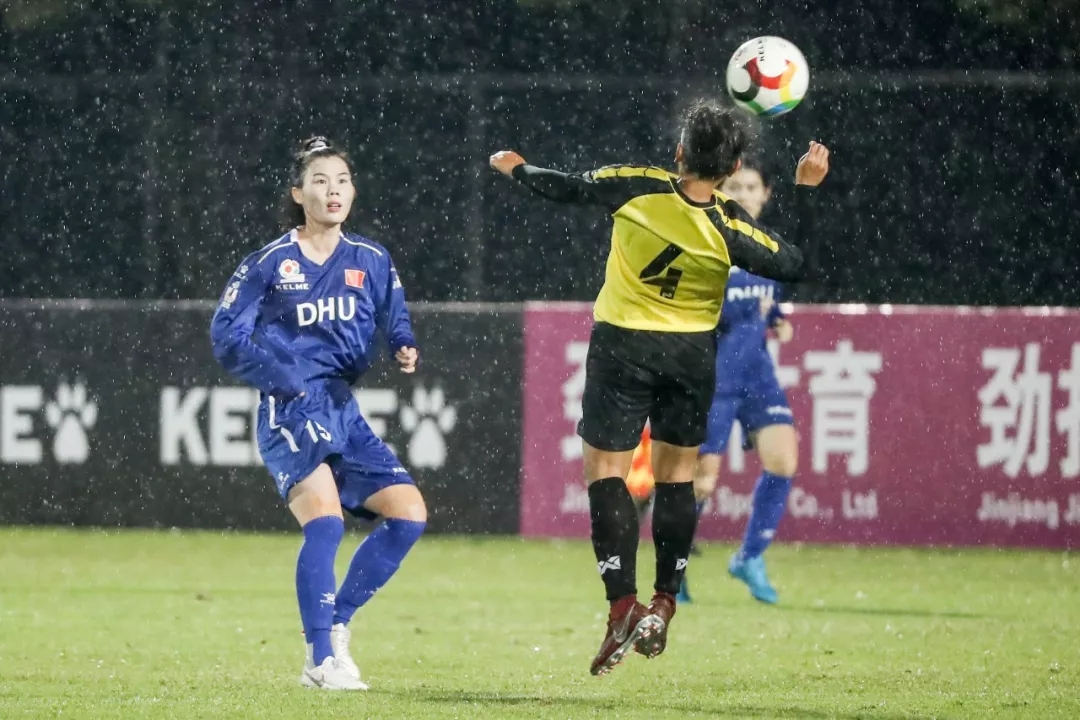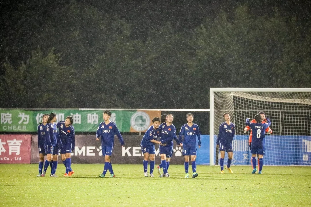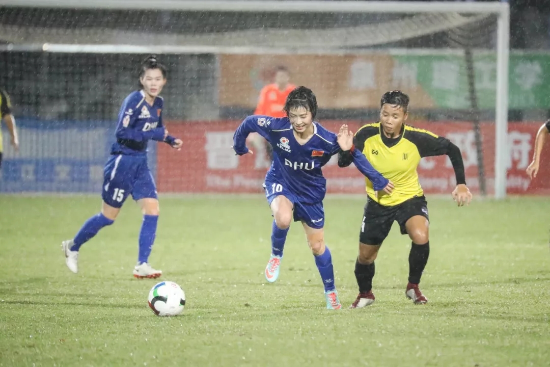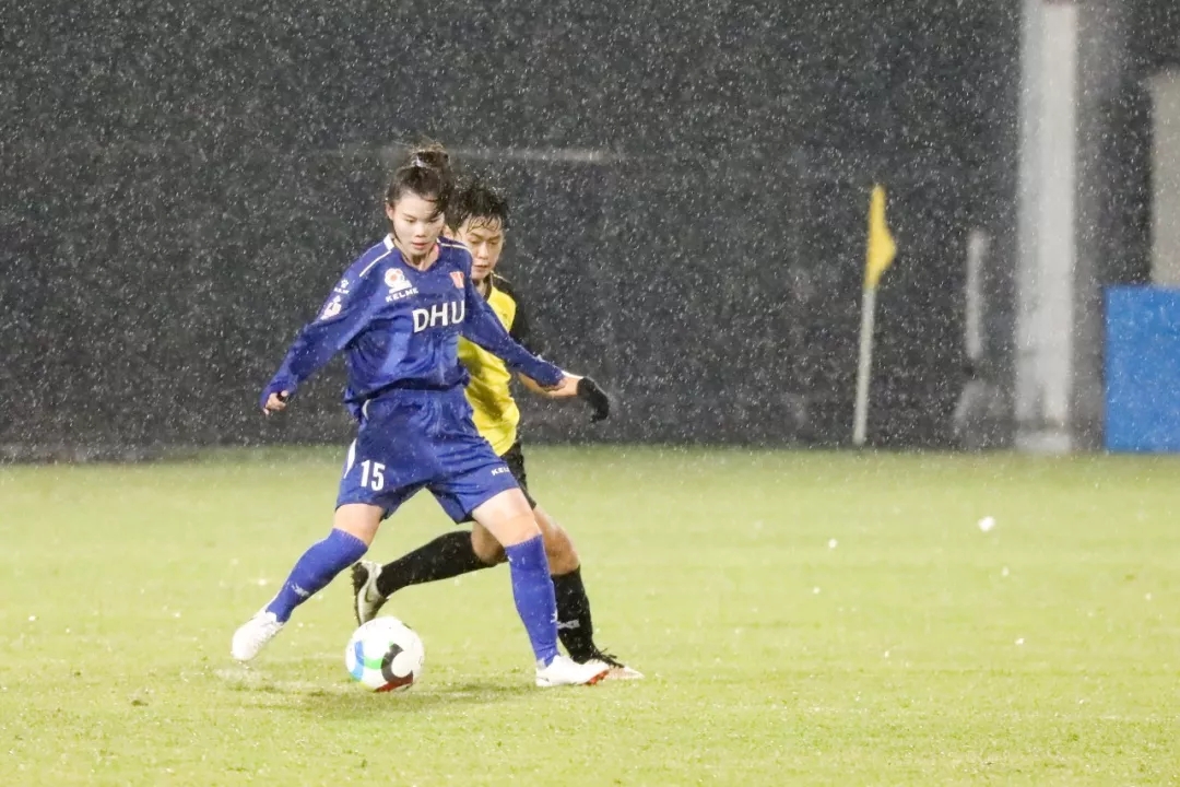 第5分钟,东华大学队16号球员尤丹丹带球走中路,在弧顶附近起脚远射,皮球打在对方球门横梁下沿后入网。东华大学队1:0,暂时领先。