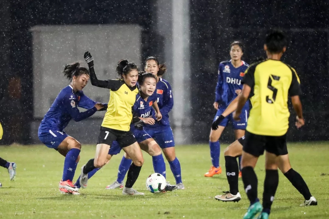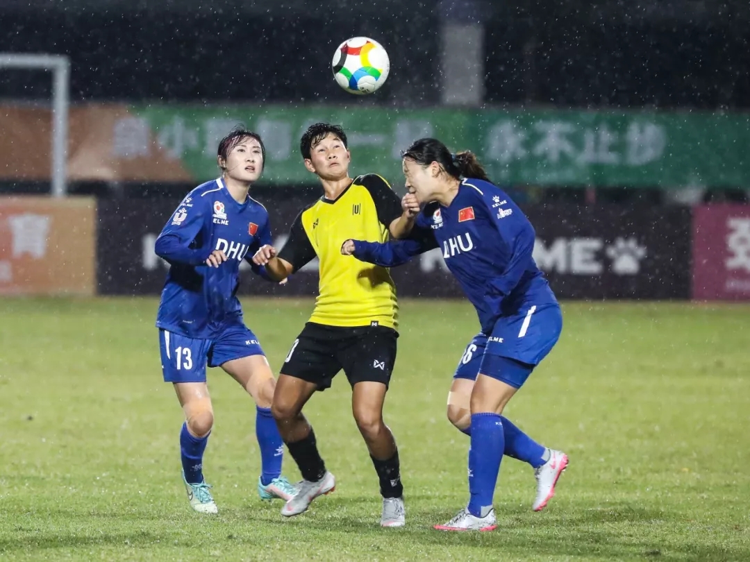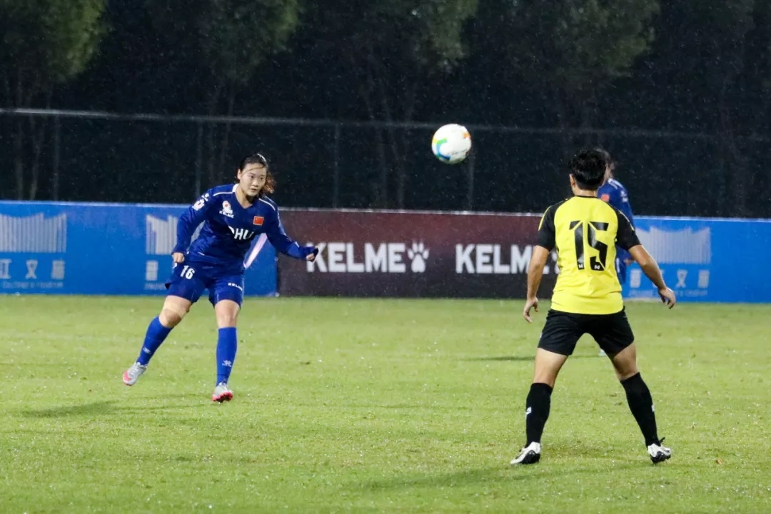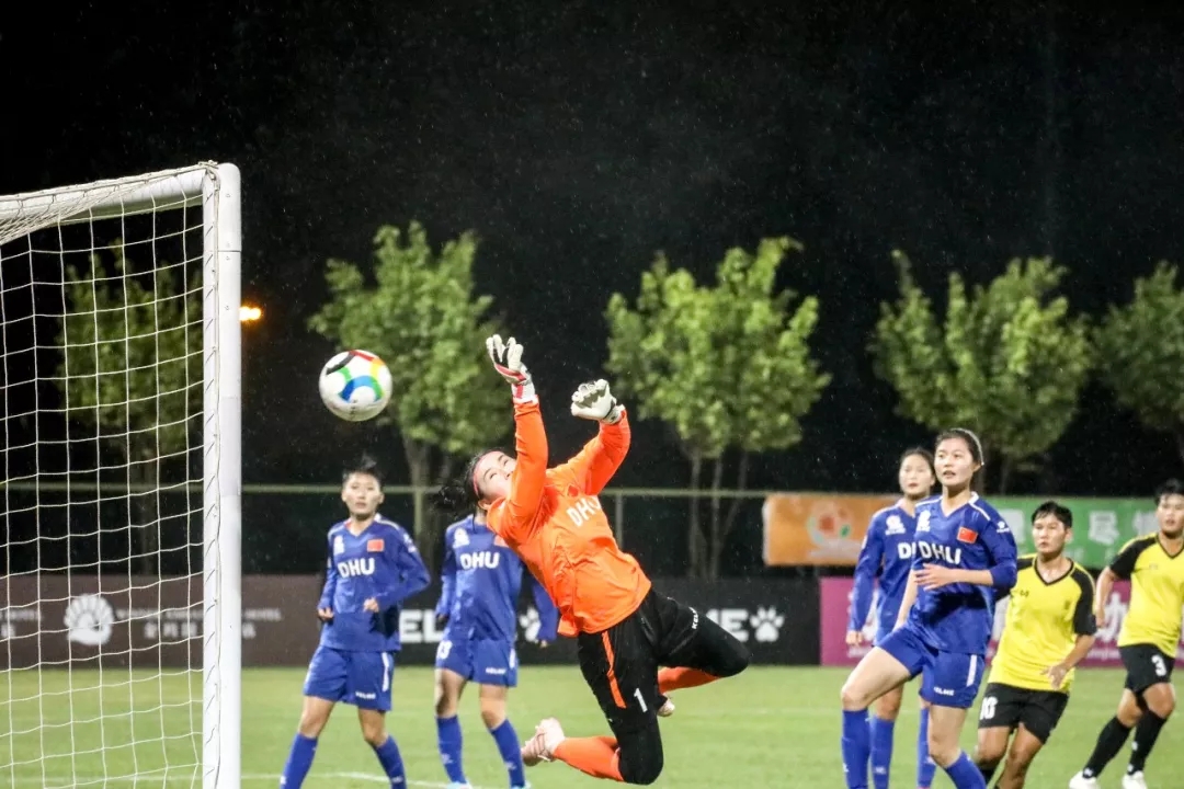 第5分钟,东华大学队16号球员尤丹丹带球走中路,在弧顶附近起脚远射,皮球打在对方球门横梁下沿后入网。东华大学队1:0,暂时领先。