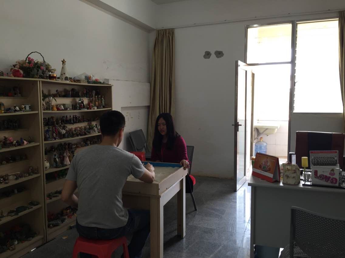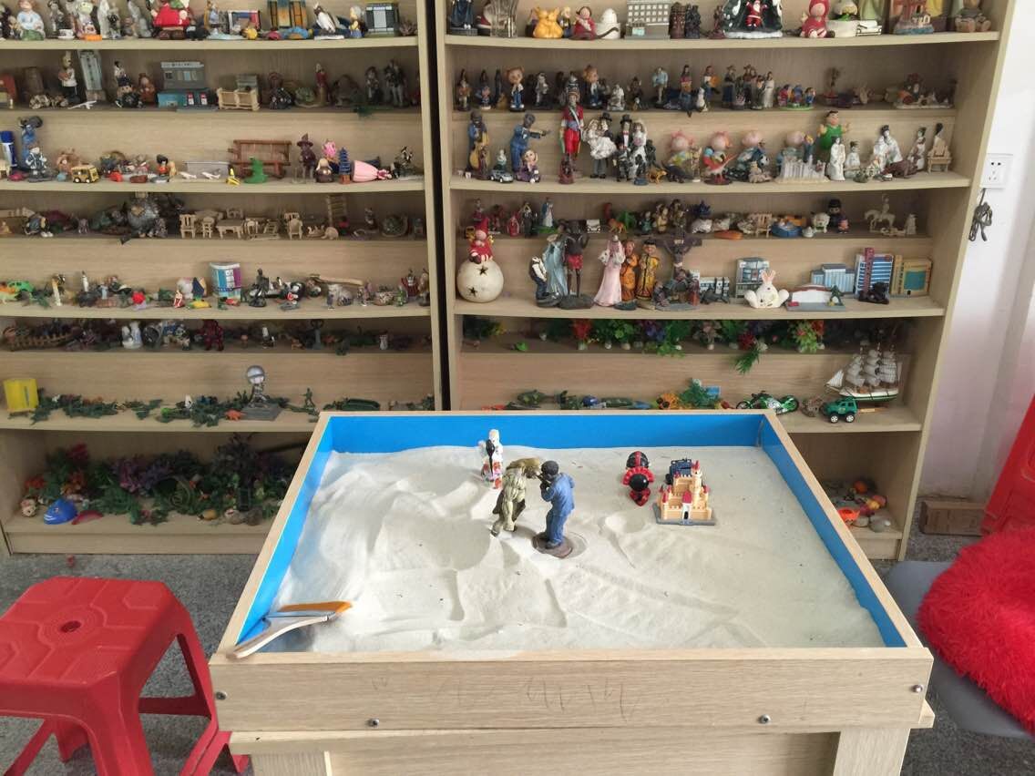 在小陈述了基本情况后,小陈很急切问王老师“我这是怎么了呢?为什么这么烦躁呢?”,王老师笑了笑说“其实你自己最清楚,想不想了解下呢,我们一起去玩个沙盘游戏怎么样?”,小陈急切地点了头,王老师把小陈带到了沙盘室,只见房间中放着一盘细沙,旁边的两个大柜子上摆满着各式各样的小玩偶,有可爱的小熊猫、仿真军人、精致的房子、小跑车、还有千姿百态的人物等,让人目不暇接。王老师告诉小陈说“这是沙盘,这里是玩具模型,你可以随意去玩,做任何你想做的事情:或你可以沙盘上摆放任何你想摆放的玩具模型,构建任何你想构建的画面。”王老师放了一首轻音乐,音乐声在沙盘室里慢悠悠地响起,气氛温和融洽。小陈挑了一栋房子模型、一堆人偶、一辆小车进行摆放,“人偶对决,汽车四脚操天、房子被沙掩盖……”小陈沉浸在沙盘游戏中玩的不亦乐乎。