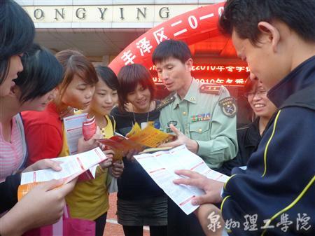 10月 26日下午 4:30,“丰泽区2010年冬季征兵工作宣传咨询会”在我校思恩楼办公大厅门口举行,众多学生聚集会场了解2010年冬季征兵的相关信息。本次活动由我校征兵办与丰泽区征兵办联合开展,集中向同学们宣传了今年冬季征兵的对象及条件、招收单位及专业、招收程序和时间安排以及国家关于从普通高校毕业生中征兵的相关政策。咨询活动开展得顺利而热烈,当兵的经历是一笔不可多得的财富,参军报国既是磨砺人生、实现理想抱负的重要途径,更是热爱祖国的高尚行为。