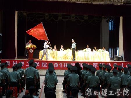 随着雄壮嘹亮的军歌响起,中国人民解放军73141部队军训团团长杨超接过苏校长手中的军旗,2010级新生军训动员大会随即开始。各位军训军官列坐前排,飒爽英姿与新生们整齐划一的军服着装相得益彰。