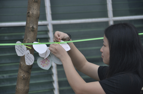 同学们亲手将写满祝福的小卡片系在树上