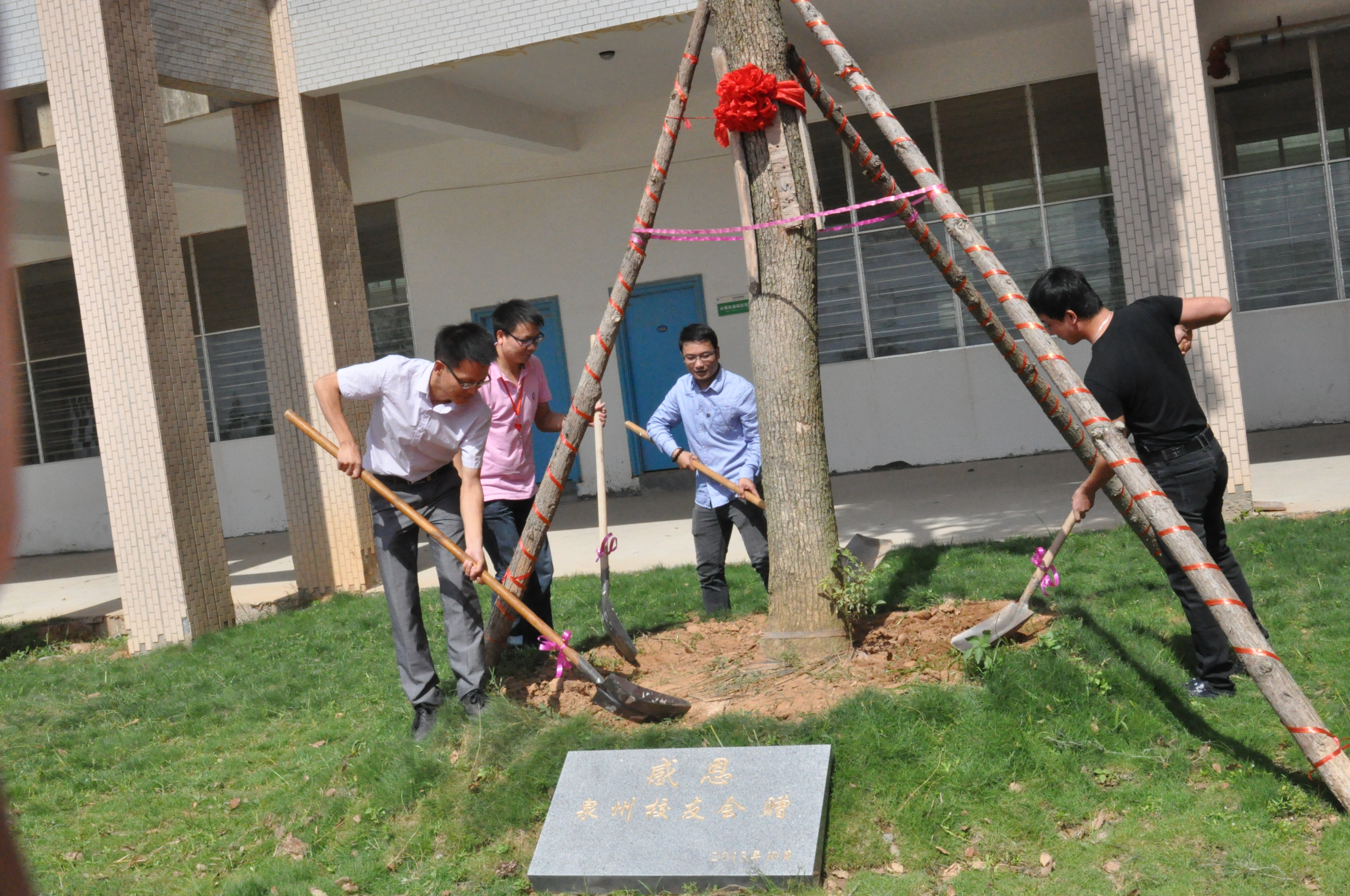 之后,“赠树仪式”进入揭牌议程,苏志明总会长和余克彬会长一起揭开刻有“感恩,泉州校友会2013年10月赠”的大理石碑,代表了校友们对母校的眷念情怀。在东侧教学楼前,校友们种下了一棵象征绿色、友爱、奋发向上的樟树,感恩那些年母校对他们的培养和教育。接着,校友总会副会长兼秘书长林文艺老师和会长余克彬先生、理事长张智鹏先生、副理事长杨火车先生一起为该树培土,全体校友们在该树系上祝福卡片。“赠树仪式”结束后,全体校友和学校领导在这棵感恩树和感恩碑前一起合影留念。