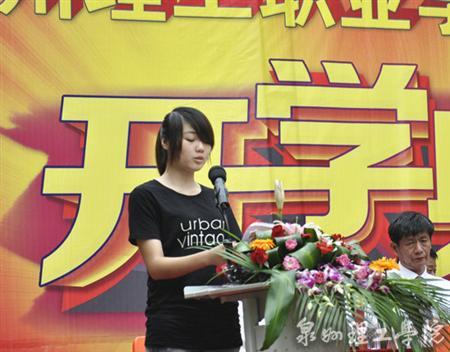 教师代表商贸系姜姝宇上台发言,勉励新生们从零开始,抓住分分秒秒,用心学习,勤思进取,全面发展。