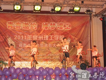 11级辅导员和学生们共同演绎的动感单车《倾城之恋》,实现了单车与人的完美结合,让大家感受到了运动的魅力,使现场气氛顿时沸腾。学工处教师和学生们朗诵的《理工师生共建和谐的校园生活》让每位在场的新同学感受到学校的温暖。