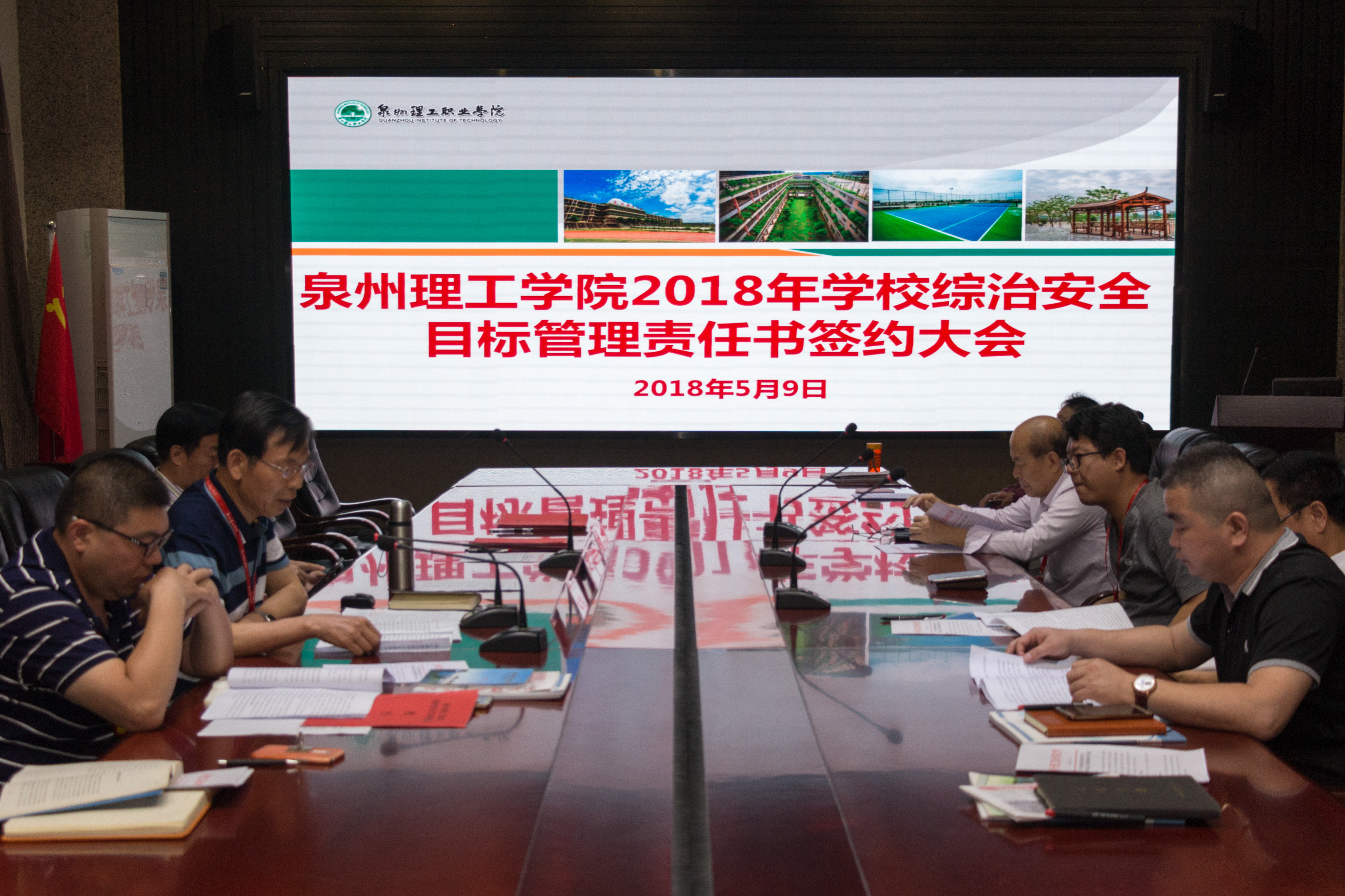 5月9号下午,2018年综治安全目标管理责任书签订仪式在第一会议室举行。我校臧校长、党委书记林其天、副校长庄文瑞等校领导及各部门相关负责人参加会议。会上各院系、部门相关负责人签订安全责任书。