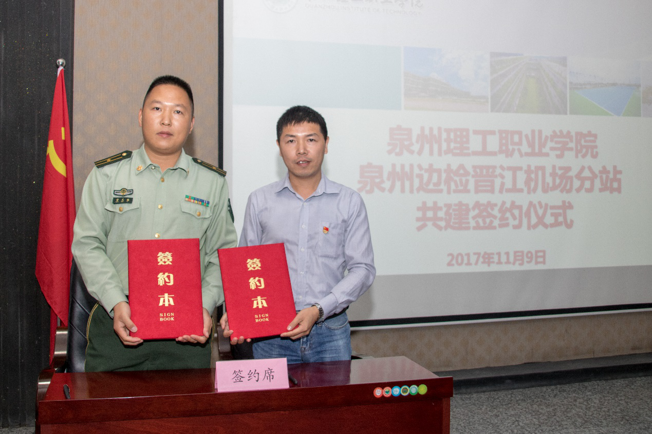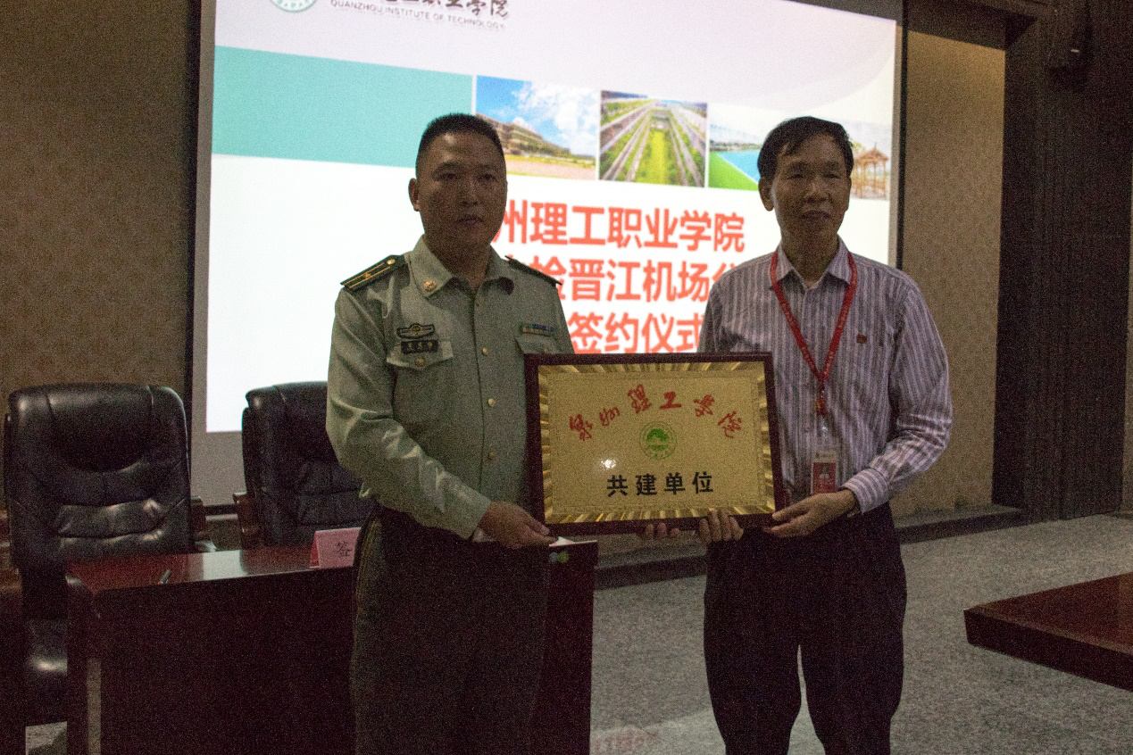会上,由泉州理工学院校长助理、招生就业处处长蔡金佩与泉州边检晋江机场分站副站长管文福签订共建协议,同时由庄文瑞副校长授“共建单位”牌匾。