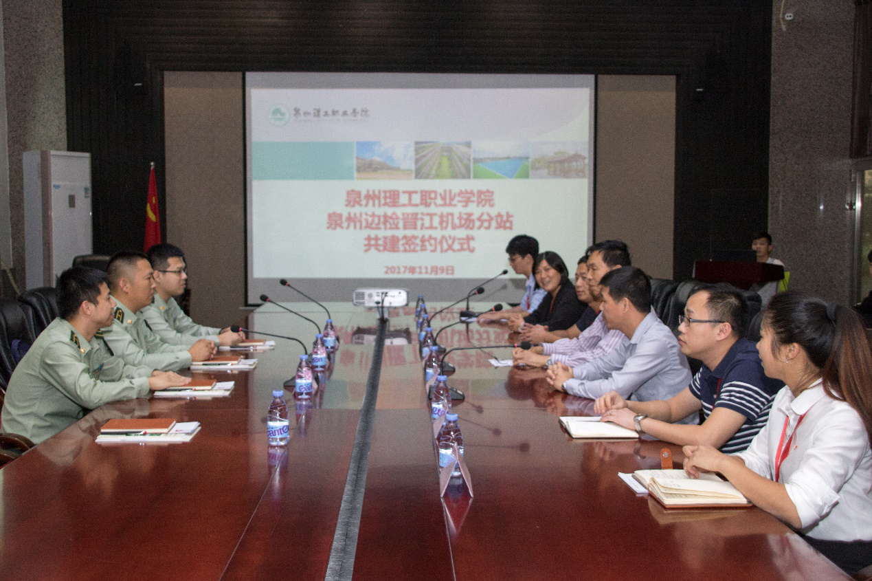 11月9日下午,泉州理工学院与泉州边检晋江机场分站共建签约、授牌仪式在第一会议室隆重举行。泉州边检晋江机场分站副站长管文福、分站一科教员王琦、分站一科科长李鑫、检查员代表肖琳,泉州理工学院副校长庄文瑞老师,泉州理工学院校长助理,招生就业处处长、校团委书记蔡金佩老师,学工处副处长黄镇红、团委副书记蒋滨滨老师,建筑设计系党总支书记杨永华、建筑设计系第二党支部书记王秋玲、就业指导中心副主任黄世强以及主要学生干部出席本次活动。会议由黄世强老师主持。