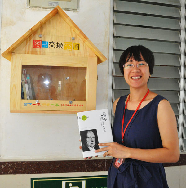 图书交换空间刚刚安装,16计算机应用专业的欧艺垒就将宿舍里闲置的2本书籍《麦田里的守望者》、《摆渡人》,交换了《中国近代史》和《追风筝的人》。欧艺垒说,当她看到宿舍楼下安装的小木屋,觉得好新奇,当得知可以交换图书,马上就将看过的书籍拿来交换。“这样读书好方便,闲置的好书可以拿来分享,不会失去好书的价值,也可以跟别人分享阅读的快乐。”