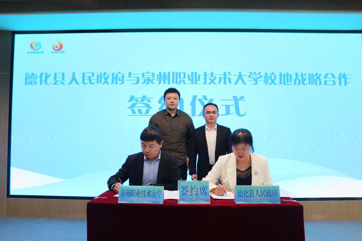 11月24日,德化县人民政府与泉州职业技术大学举行校地合作签约仪式,德化县委常委、组织部部长熊建军,副县长林金雪、组织部副部长陈志宇,校党委副书记、副校长蔡金佩及就业指导中心相关人员出席签约仪式。