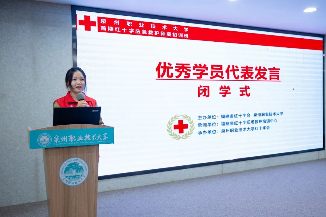 闭学式上,优秀学员张燕玲发言。她说,经过六天的学习,感受颇深,受益匪浅。要感谢各位老师用心教学指导,也感谢学校提供此次培训机会,培训中不仅学到了相关技能,大家还相互学习、相互交流、相互促进,感受到了团队力量。她表示将尽己所能宣传应急救护技能的重要性,并运用所学技能积极参与应急救护志愿服务。
