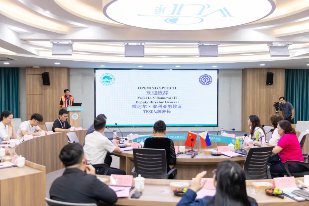 吴滨如致辞,对维达尔·维利亚努埃瓦一行的到来表示热烈欢迎。她向来宾简要介绍学校办学理念和建设成果。她表示,此次牵头召集“可再生能源与电动汽车”领域相关标准的制定,得到中国多所中高本职业院校的积极响应,并获得中国汽车工程学会和全国汽车职业教育教学指导委员会的高度关注和支持。相信这个项目一定能很好地完成,成为推动中菲两国职业教育领域合作的重要成果。并希望借此机会,进一步探讨更多合作的可能性,共同推动职业教育的创新与发展。
