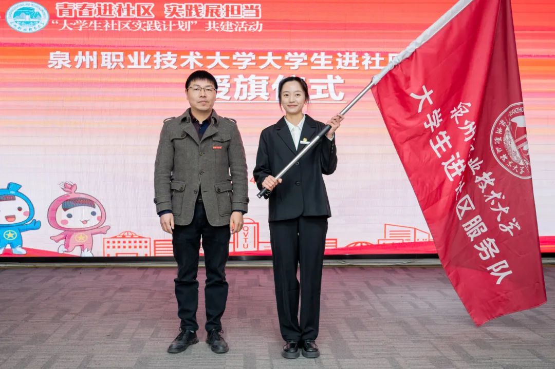 ▲ 校党委副书记、副校长蔡金佩为泉州职业技术大学大学生进社区服务队授旗
