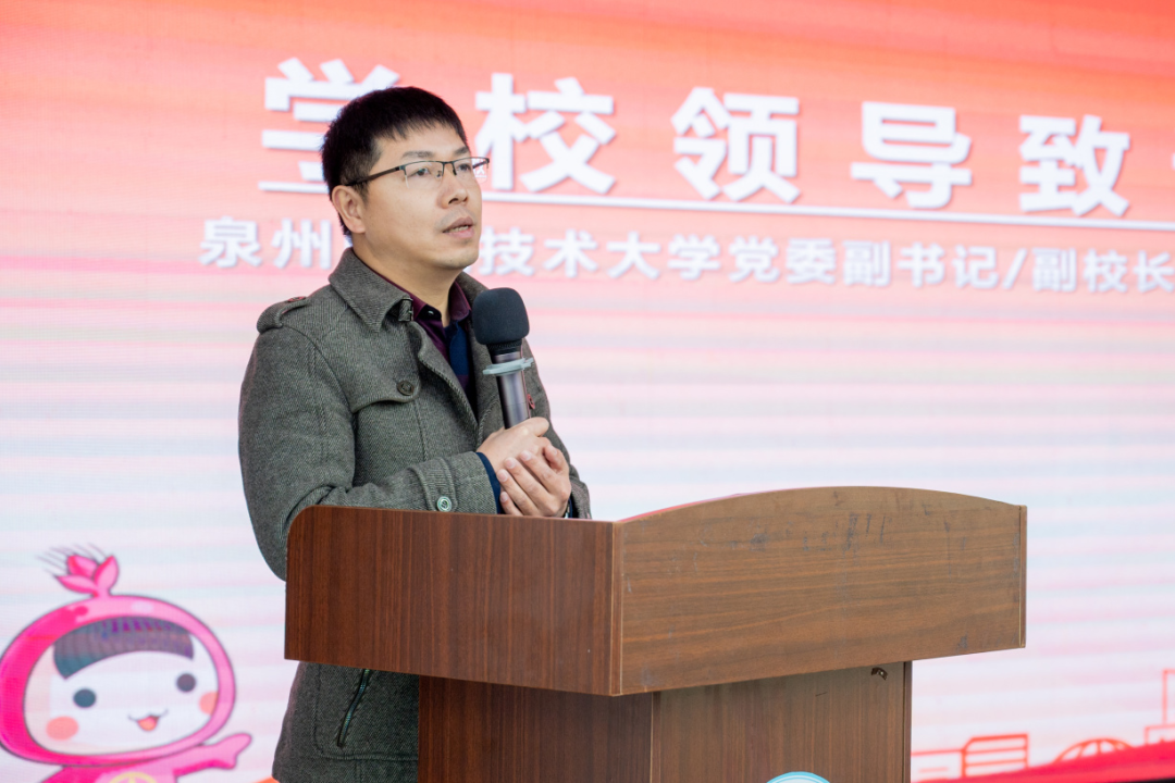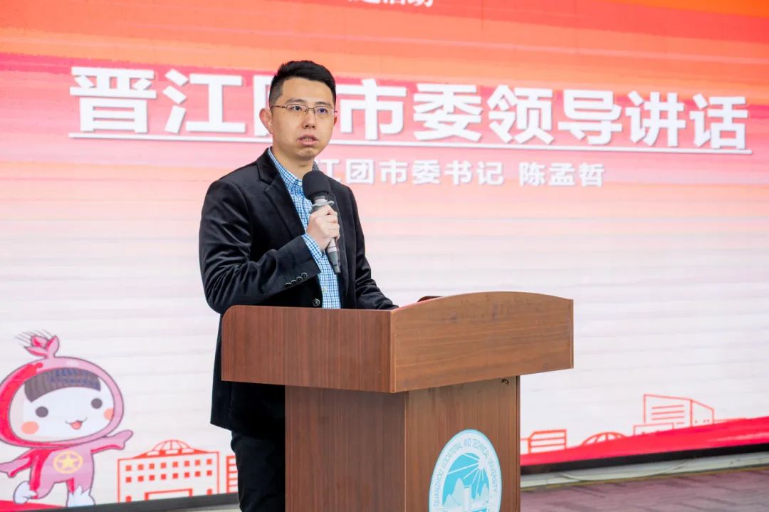蔡金佩代表学校致辞。他指出,近年来我校深入贯彻落实习近平总书记关于青年工作的重要思想,团结带领广大青年建功新时代,奋进新征程,形成校地共青团“共建、共享、共赢”的良好局面,切实满足新时代青年成长成才需求,不断提高团组织的组织力、引领力、服务力和大局贡献度,为持续推动共青团事业和助力城市高质量发展贡献青春力量。2023年我校牵头推动申报的晋江市域产教联合体入选首批国家级市域产教联合体名单,双方将持续深化合作,加强资源整合,促进校地共建、资源共享、人才共育的功能,让我校大学生走进晋江、服务晋江、未来扎根晋江,努力在服务社会的大舞台中,展现新作为、作出新贡献、取得新发展。