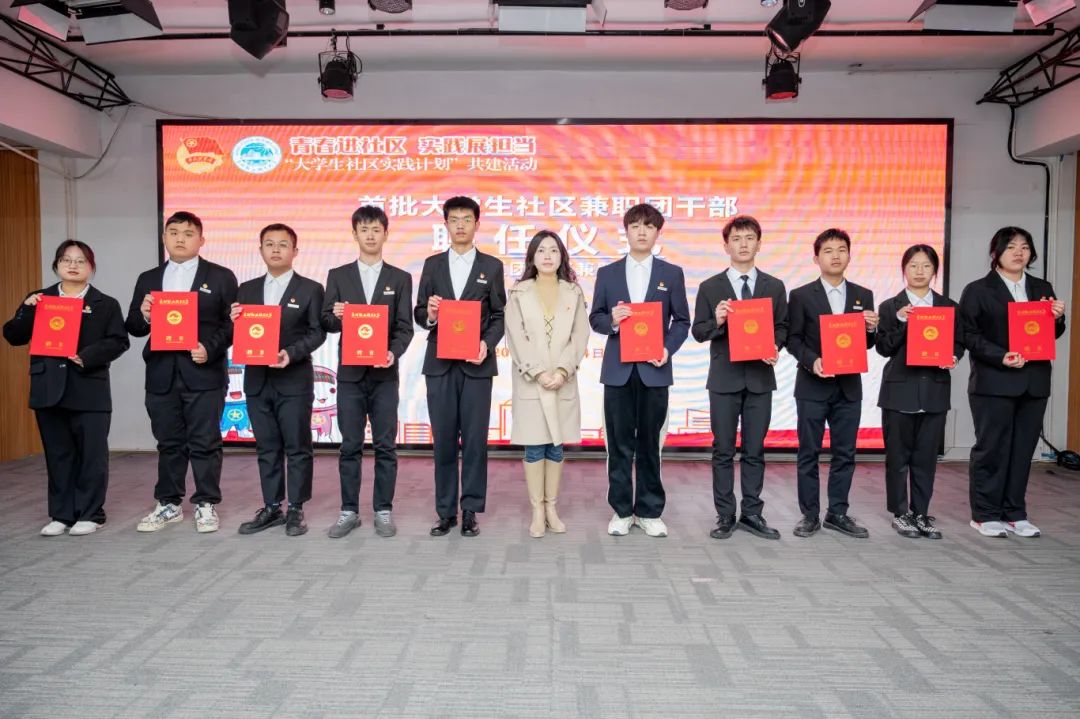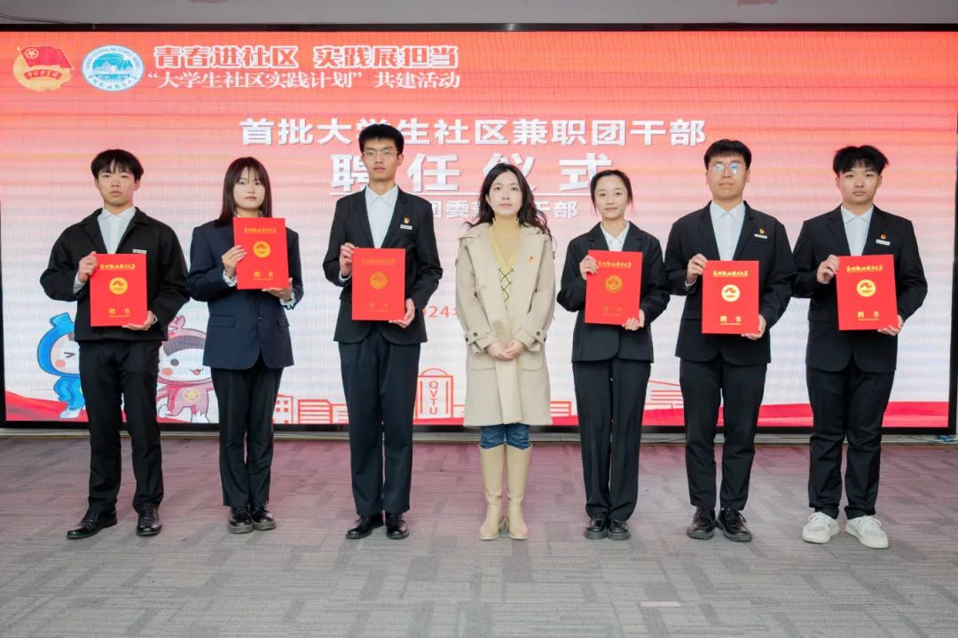 ▲ 晋江团市委副书记王思思为首批大学生社区兼职团干部颁发聘书(6名镇街兼职团干部及10名社区/村兼职团干部代表)