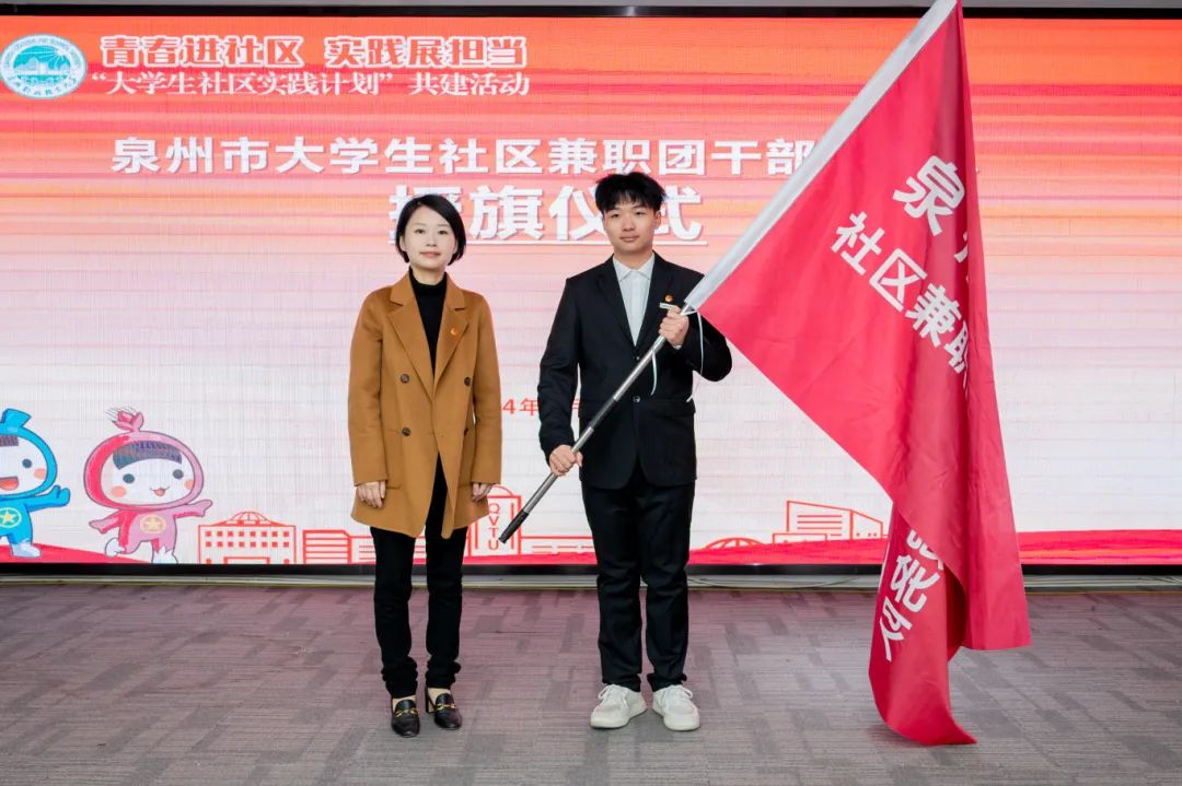 ▲ 泉州团市委副书记傅漪为泉州市大学生社区兼职团干部服务队授旗