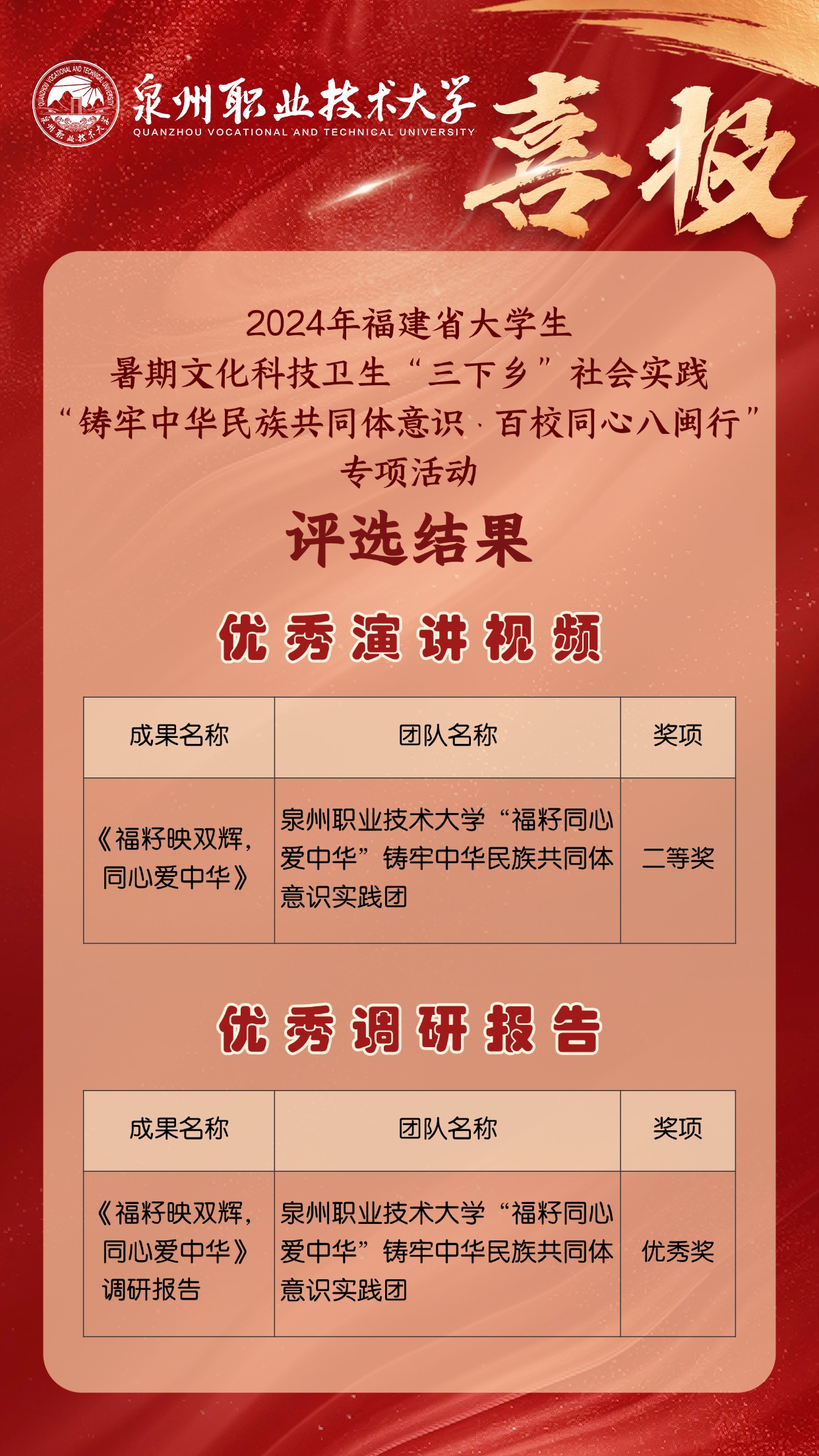 同时,该团队在2024年福建省大学生暑期文化科技卫生“三下乡”社会实践“铸牢中华民族共同体意识·百校同心八闽行”专项活动评选中,《福籽映双辉,同心爱中华》主题演讲荣获省级二等奖,调研报告获优秀奖。