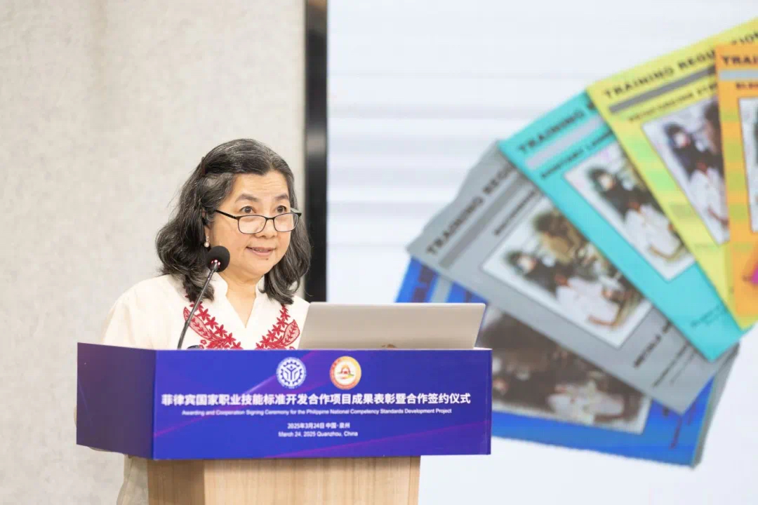 张红阳致辞,她表示,在可再生能源和电动汽车领域的一期项目中,泉州职业技术大学、山东工程职业技术大学、晋江华侨职业中专学校等参建院校齐心协力、攻坚克难,在不同标准开发任务中发挥关键作用,完成多项重要职业技能标准的开发工作。此次活动大家共同见证一期的项目成果,这些是中菲职业教育合作的重要结晶,为菲律宾相关行业技能人才培养提供有力依据。接下来的二期项目挑战与机遇并存,中菲丝路学院基金会将加强与菲律宾TESDA的沟通协作,精准把握菲律宾职业教育需求,并深化与中方院校的合作,充分整合资源,推动标准开发工作向更高水平迈进。
