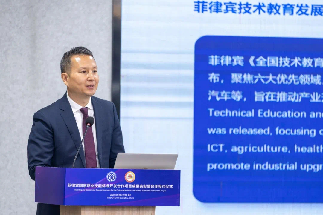 埃尔·西德·卡斯蒂略致辞,他表示,中菲职业教育合作将聚焦中国先进经验,借鉴中国校企合作、双元制培训体系及数字化技能培训等模式,推动菲律宾职业教育体系升级,助力现代化技能发展体系的构建。通过加强合作促进职业资格全球互认,提升菲律宾劳动者跨境就业竞争力。他指出,TESDA计划通过师资交流与国际合作重塑职业教育社会形象,扩大招生规模,培养具有全球竞争力的菲律宾人才,推动国家经济转型与可持续发展。此次活动标志着中菲职业教育合作迈入新阶段,为菲律宾劳动者参与全球竞争提供战略支撑。