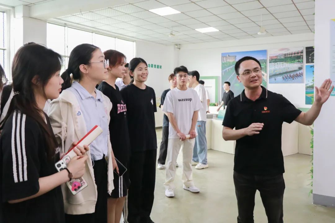 在绿色建筑成果展厅内,张艺能带领同学们依次参观了生态园区规划与设计展区、绿色施工方法展区以及功能性建筑材料的展区。他向大家详细介绍了学校节水利用的示范模型、新型墙体技术、新型旋转气流百叶窗,以及具有自主知识产权的功能性建筑材料产品等,分享了绿色建筑技术中关于节地、节水、节材、节能的应用。