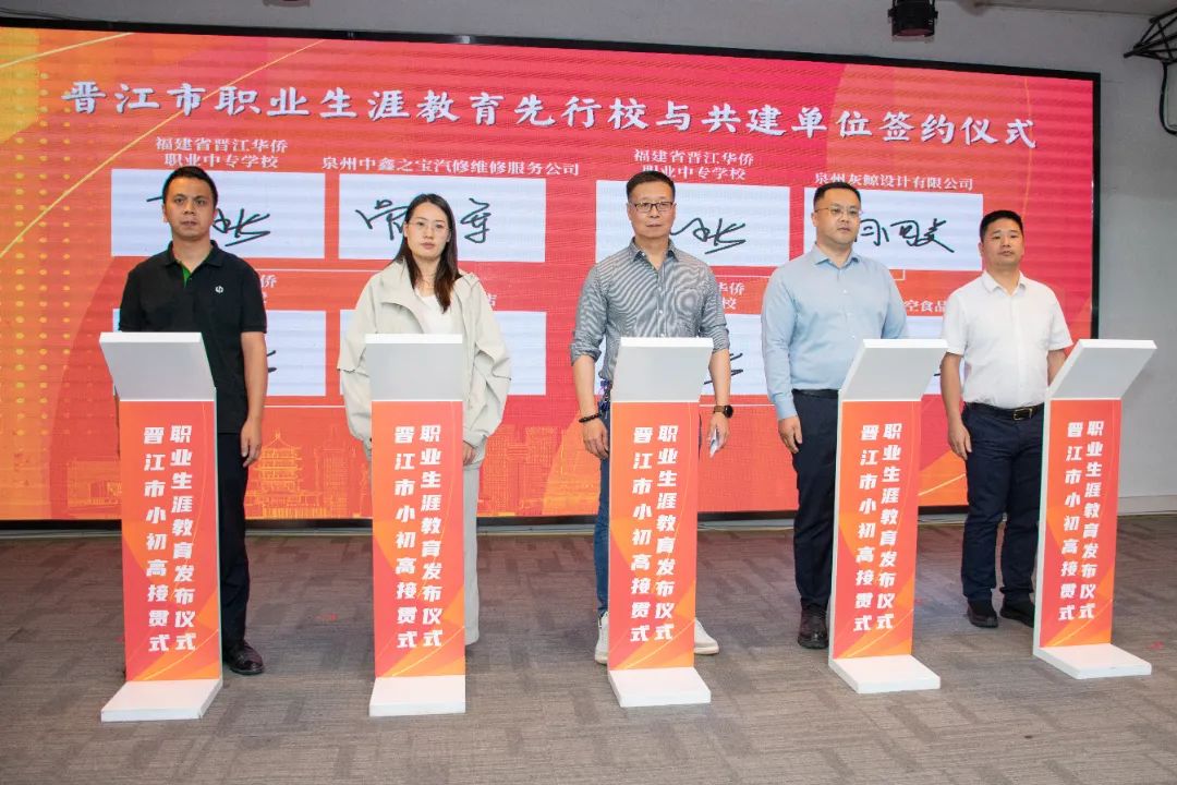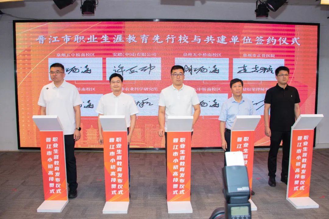 会上举行晋江市职业生涯教育先行校与共建单位的签约仪式。晋江市第二实验小学、晋江市首峰中学、泉州五中桥南校区、福建省晋江华侨职业中专学校等13所先行校与泉州职业技术大学、安踏(中国)有限公司、福建盼盼食品有限公司、福建恒安集团有限公司、福建省晋江华侨职业中专学校、晋江市晋兴职业中专学校等共建单位将携手并进,开展跨界融合,为职业生涯教育注入强劲动能,让教育从“单向输出”转向“共生共创”。