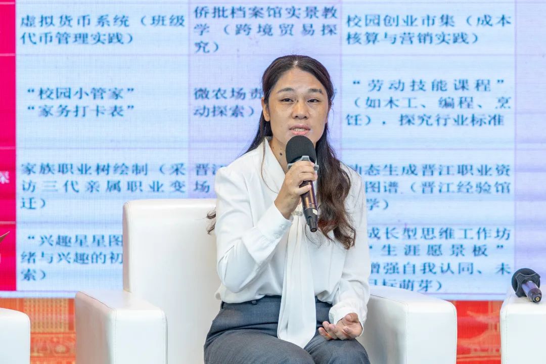 最后,晋江市小初高接贯式职业生涯教育沙龙环节由蔡金佩主持。他围绕“小初高接贯式职业生涯教育的实践探索”主题,与晋江市第二实验小学副校长王亚珍、泉州五中桥南校区心理组组长张燕玲、晋江市首峰中学政教处副主任陈长华、晋江华侨职校学生处负责人赵成建、嘉宾江夏学院揭红兰教授等人展开对话。