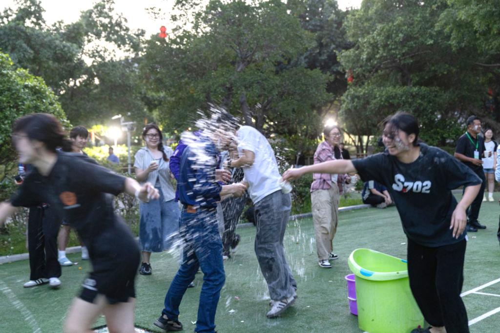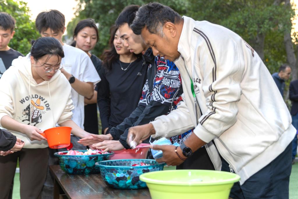 到场的师生们也兴致勃勃参与其中,感受这一独特的礼仪文化。随后,泼水互动环节将活动推向高潮,大家纷纷拿起水杯、水瓢、水盆等用具,互相泼洒清水,传递欢乐与祝福。