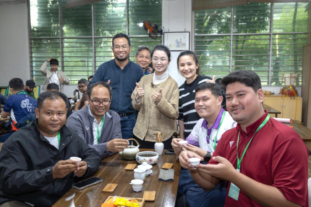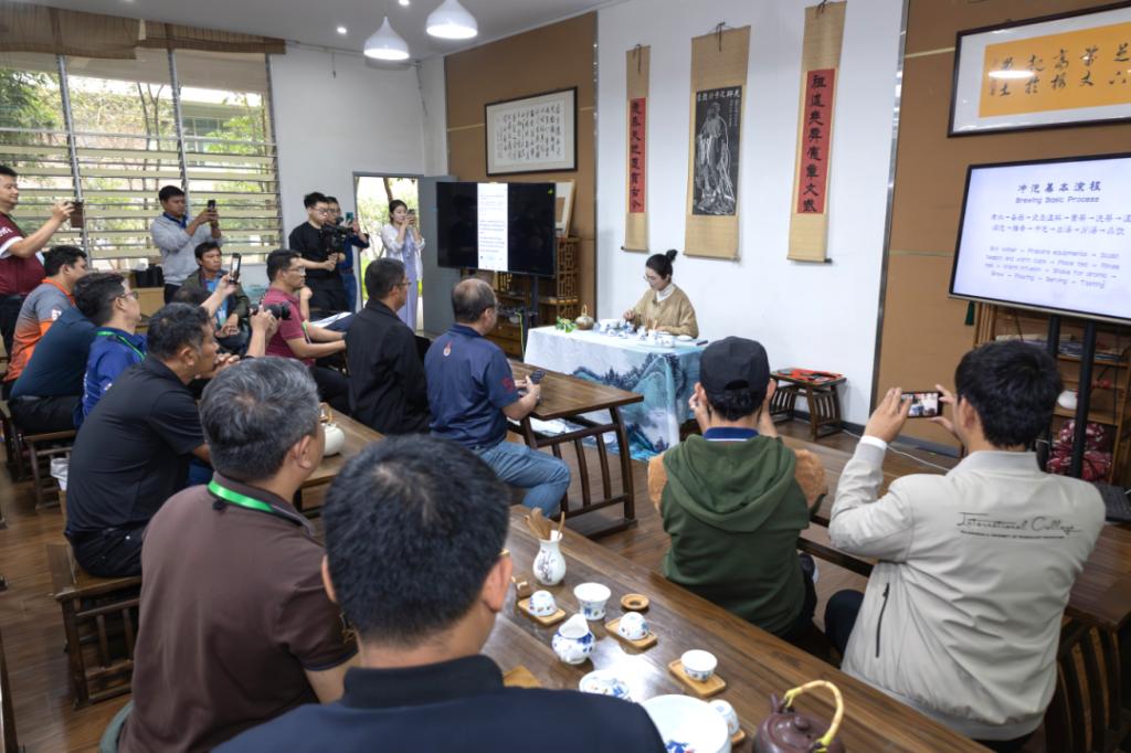 在当天进行的茶艺课上,学员们观赏了茶艺老师何水平的茶艺表演,并在何老师的指导下,感受了一杯春茶在舌尖绽放芬芳的美妙滋味。随后,28位泰国老师还现场体验了泡茶、奉茶和一起品茶的乐趣,从中知道了泡好一杯茶的学问,真切了解了中国茶文化的博大精深。