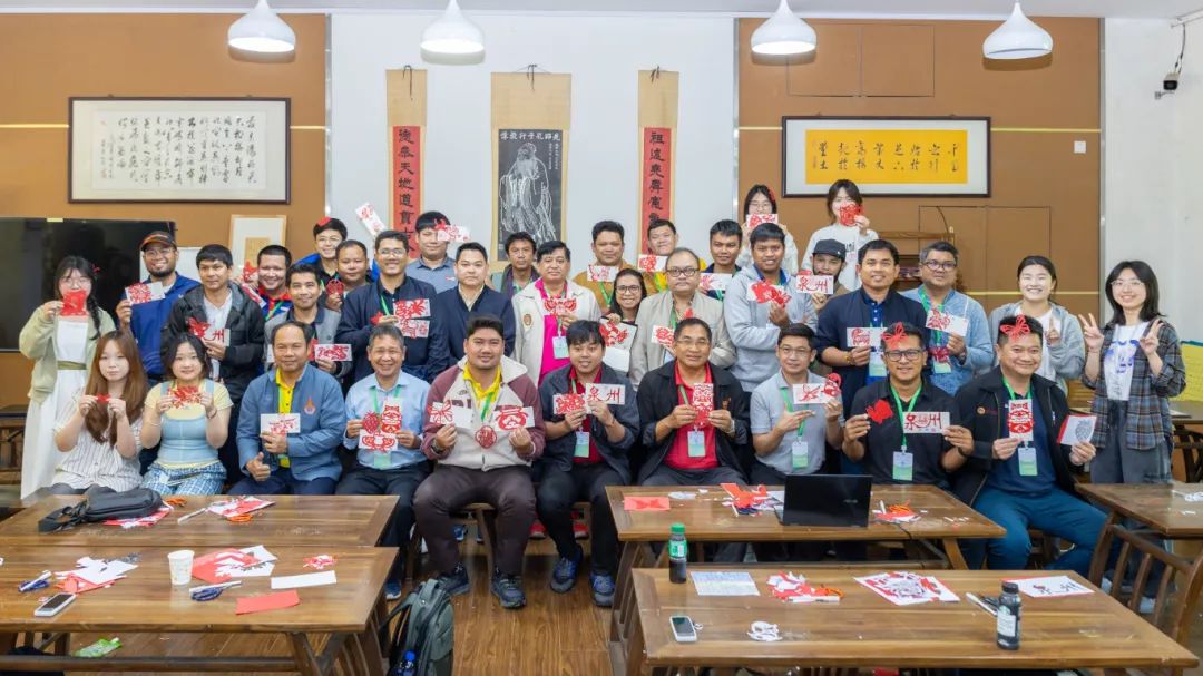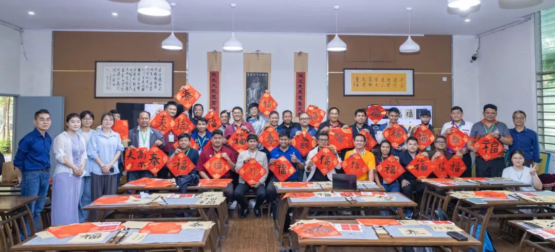 “通过了解一个国家的文字来了解一个国家的文化,是一种非常重要的方式。”在体验环节中,洪老师耐心地为学员们讲解中国书法的特点并演示篆、隶、楷、行草不同书体的写法。大家拿起毛笔认真书写,感受着毛笔在纸张上行走的魅力。学员Attaphon认真地用毛笔写了一个大大的“福”字,他说自己很喜欢中国文化,曾花了很多时间学习中文,“中华文化非常有魅力。”