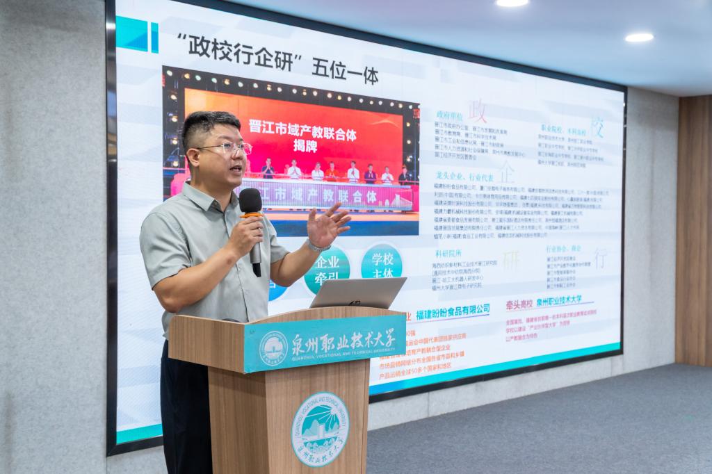 报告会上,郭霏霏代表学校对毛发金一行的到访表示热烈欢迎,并以《打造国家级市域产教联合体的“晋江样板”》为题做专题分享。他强调,学校始终扎根“晋江经验”发源地,依托民营经济活跃的区位优势,紧扣“纺织、鞋服、陶瓷、食品”四大产业集群,精准对接区域产业需求,锚定供需平衡点,主动优化专业布局和课程设置。同时,学校深化实践育人模式,通过引入“校企协同育人”“企业导师实地驻校”等真实项目进课堂,既夯实了服务区域经济发展的基础,又为提升人才培养质量筑牢了根基。